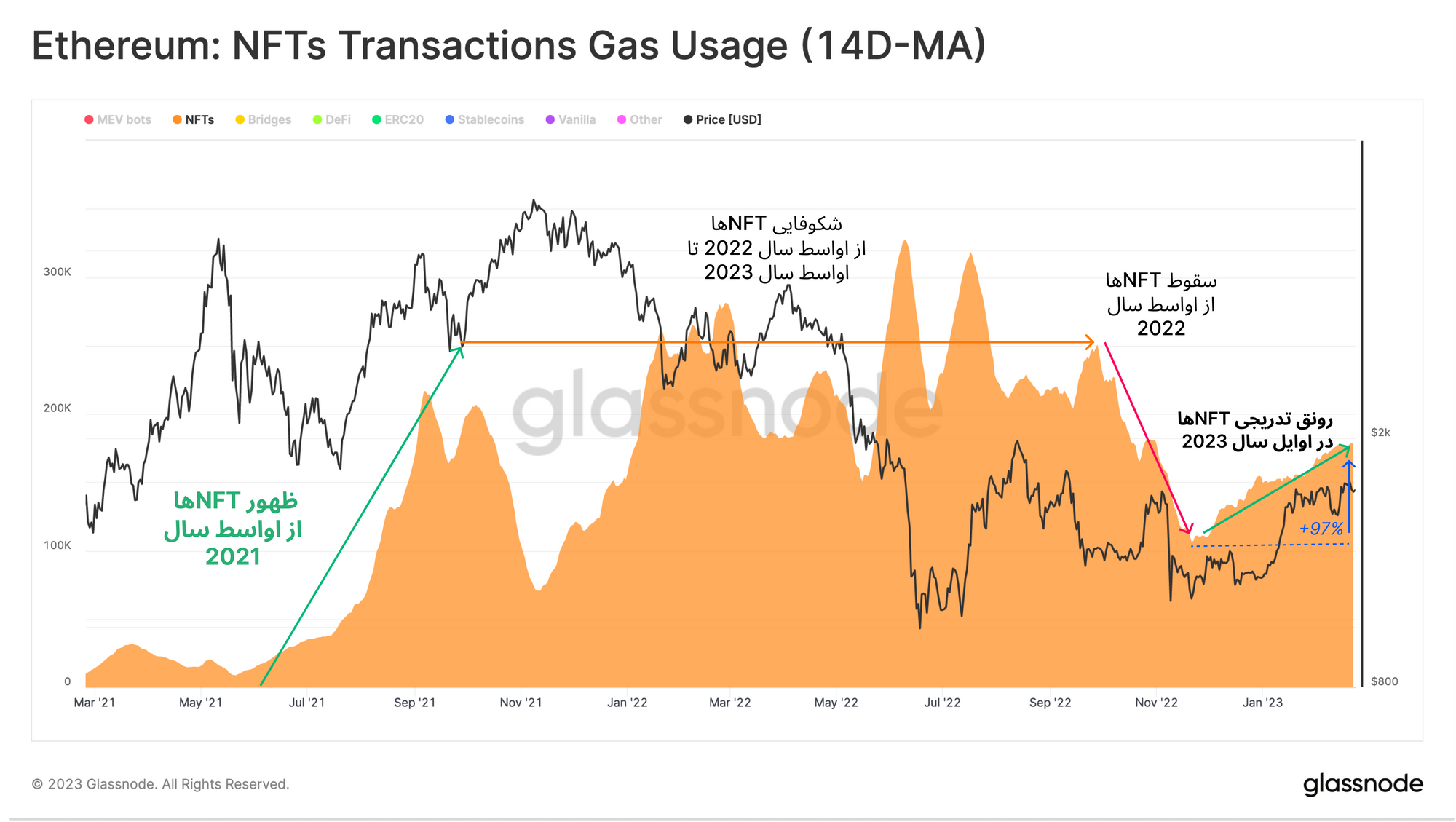 اگر میزان Gas مصرف شده در انواع تراکنشهای شبکه را با دقت بیشتری بررسی کنیم، مشاهده خواهیم کرد که علت اصلی افزایش نسبی فعالیت در شبکه اتریوم، رشد دوباره بازار NFT هاست. در پایان سال ۲۰۲۲ فعالیت کاربران در شبکه دچار افت شدیدی شده بود؛ اما اکنون مشاهده میکنیم که در دو ماه متوالی، Gas مصرف شده در تراکنشهای NFT تا ۹۷ درصد افزایش داشته است. به نظر میرسد که بازار NFT ها همانند چرخههای گذشته، به موج دیگری از شکوفایی خود در حال نزدیک شدن باشد.
