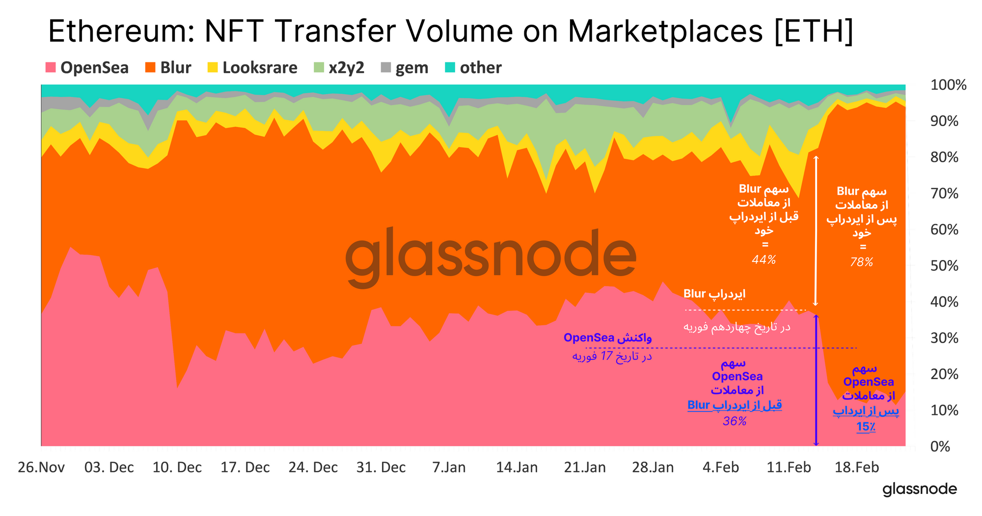 طی هفته گذشته توکن Blur حدود ۱۳ درصد از ارزش خود را از دست داد، اما Airdrop آن، دوباره توجهات را به خود جلب کرده است. در نتیجه سهم Blurاز معاملات بازار ۳۴ درصد افزایش یافت و سبب شد تا سهم بازار OpenSea، از ۳۶ درصد تا ۱۵ درصد کاهش یابد. OpenSea نیز در اقدامی غافلگیرکننده تجدید نظری در سیاستهای کارمزدی پلتفورم خود داشت؛ اما همچنان موفق به کسب مجدد سهم معاملاتی خود از بازار نشد.
