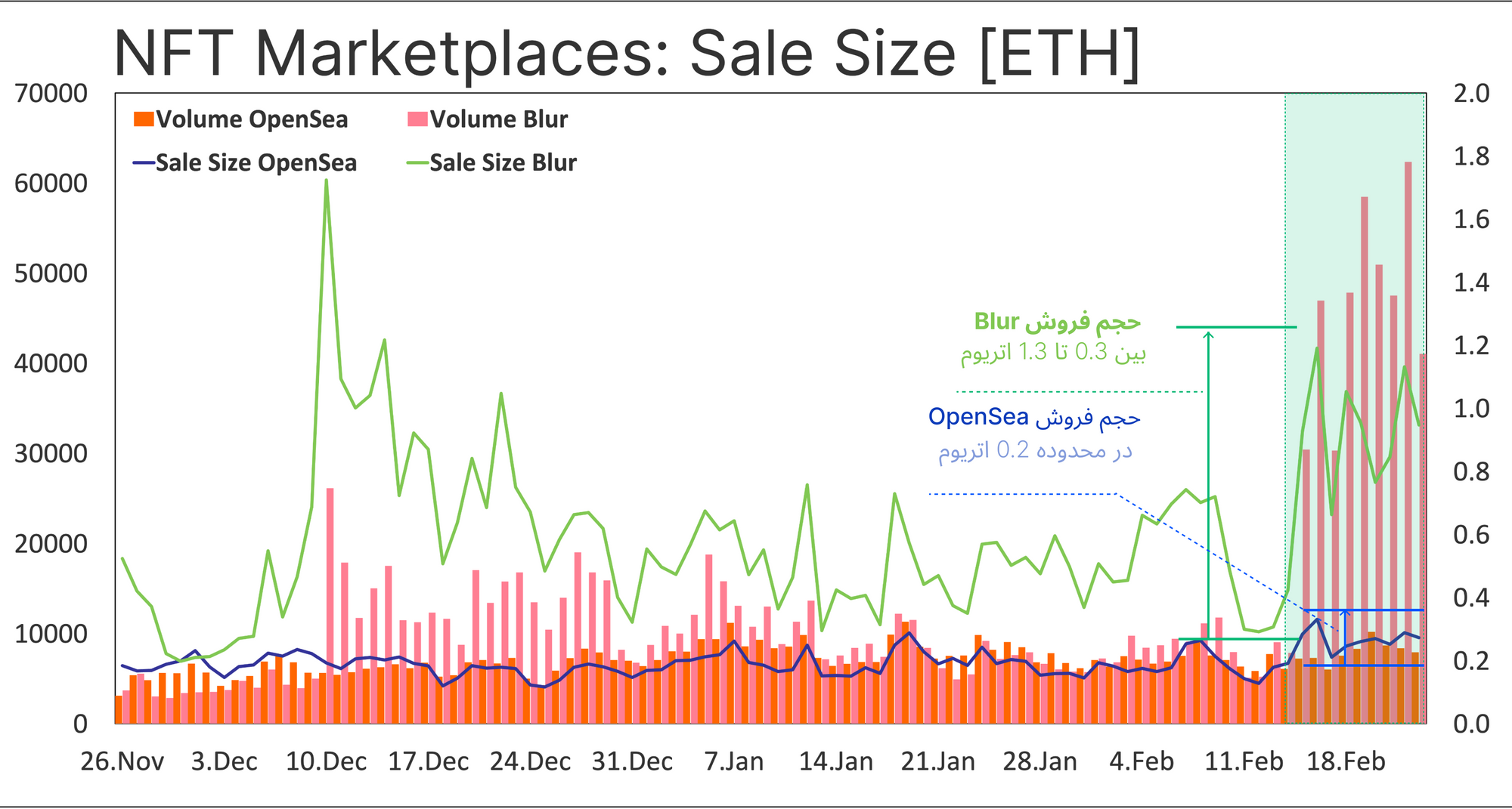 اکنون در نمودار زیر مشاهده میکنیم که حجم و سودآوری فروش NFTها در هر کدام از این دو پلتفورم چه مقدار بوده است. پلتفورم Blur در معاملات فروش خود با حجم بین ۰.۳ تا ۱.۳ اتریوم، بسیار سودآورتر از رقیب خود ظاهر شده است. حجم فروش OpenSea به مدت چندین ماه همچنان در محدوده ۰.۲ اتریوم باقی مانده است. البته باید توجه داشت که حجم فروش بالاتر، صرفا به این معنا نیست که آن پلتفورم به سودآوری بالاتری رسیده؛ همچنین میتواند به این معنا باشد که در پلتفورم مورد نظر، برای خرید NFT ها قیمت بالاتری پیشنهاد میشود.