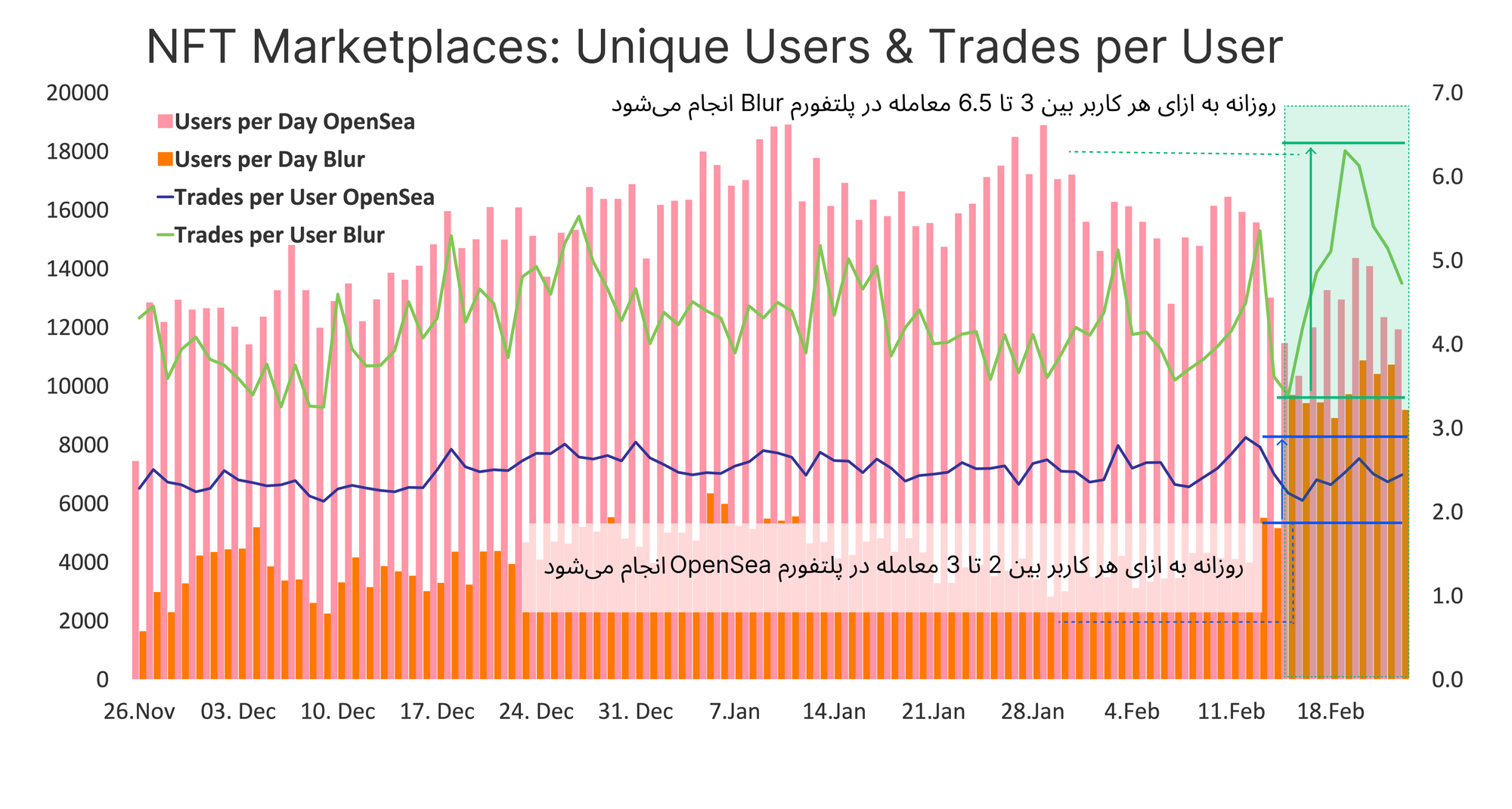 همانطور که مشاهده میکنید، در پلتفورم Blur، به عنوان برنده این رقابت، به ازای هر کاربر روزانه ۴ تا ۵ معامله انجام میشود؛ اما از طرف دیگر در پلتفورم OpenSea به صورت میانگین هر کاربر روزانه ۲ معامله انجام میدهد. هر چه تعداد معاملات فروش بیشتر باشد، فروشندگان بیشتری تمایل به لیست کردن NFT خود در آن پلتفورم خواهند داشت که در نهایت خریداران بیشتری را نیز جذب خود خواهد کرد.