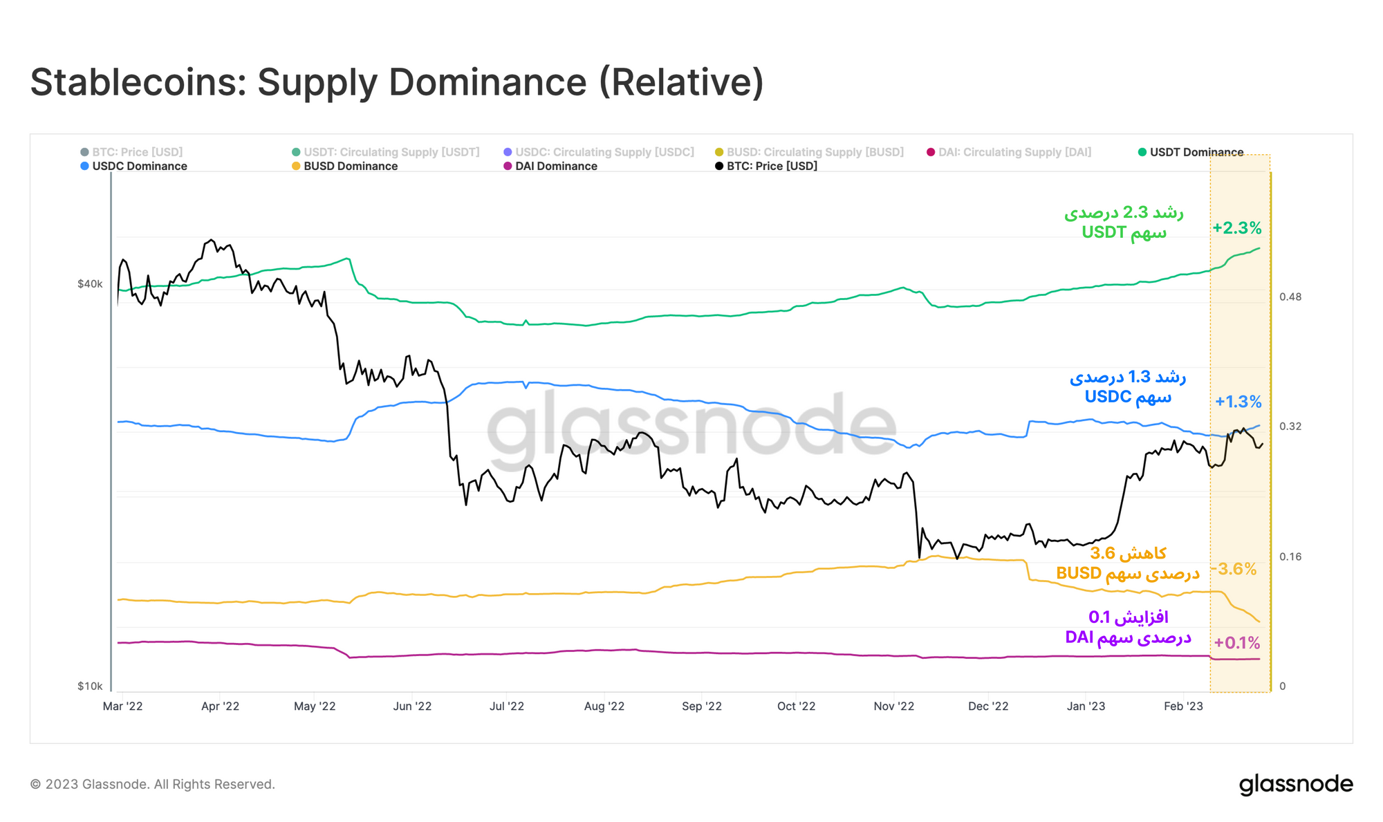 پیش از اعلامیه کمپانی Paxos، سهم BUSD در بازار استیبلکوینها، ۱۱ درصد، معادل ۱۳۶ میلیارد دلار بود. پس از توقف تولید آن، Tether با ۵۴ درصد سهم، بیشترین تسلط را بر بازار استیبلکوینها یافت. بر خلاف رویدادهای اخیر در دنیای استیبلکوینها، DAI به عنوان استیبلکوینی غیر متمرکز و ضد سانسور جایگاه خود را میان کاربران نیافته و همچنان سهم قابلتوجهی از بازار را به خود اختصاص نداده است.