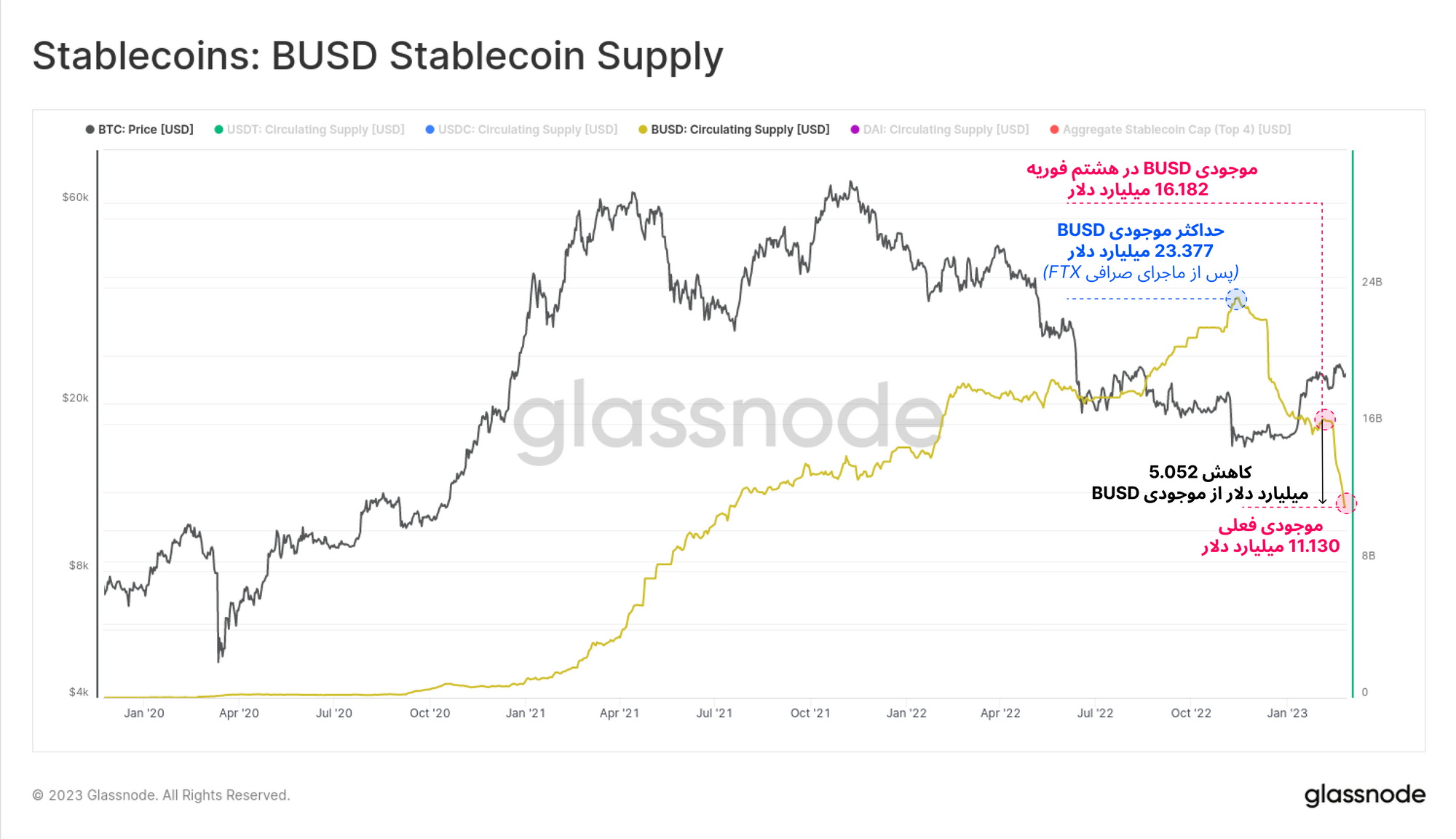 اندکی پس از این توافق، کمپانی PAXOS ، تولیدکننده استیبلکوین BUSD در تاریخ سیزدهم فوریه اعلام کرد که به دلیل فشارهای نظارتی اداره خدمات مالی ایالات نیویورک، تولید و انتشار استیبلکوین BUSDرا در تاریخ ۲۱ فوریه متوقف خواهد کرد. دارندگان استیبلکوین BUSD نیز سریعاً دارایی BUSD خود را به استیبلکوینهای دیگر، عمدتاً USDT تبدیل کردند. به دلیل بازخرید ۵.۰۵۲ میلیارد دلار BUSD ، از تاریخ هشتم فوریه ارزش بازار این استیبلکوین ۳۱.۲ درصد ریزش داشت.