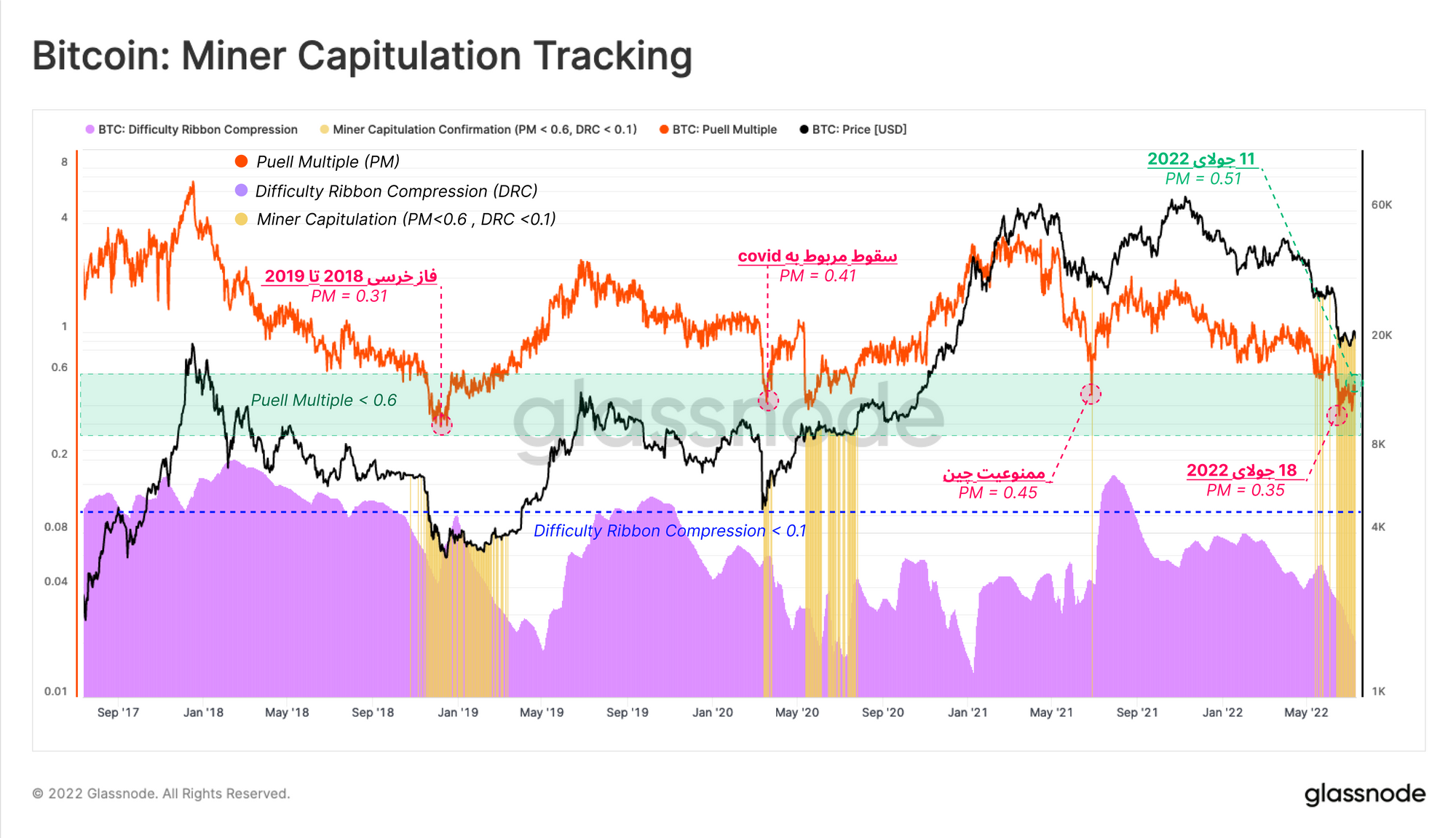 به منظور اینکه مشاهده کنیم ماینرها تا چه مقدار تسلیم شدند، از اندیکاتوری استفاده میکنیم که از دو معیار تشکیل شده و هماهنگی میان این دو معیار را میسنجد. معیار اول، Puell Multiple که میزان تحت فشار قرار گرفتن درآمد میانرها را مشخص کرده و معیار دوم، Difficulty Ribbon Compression، میزان هش ریت را مشخص میکند.