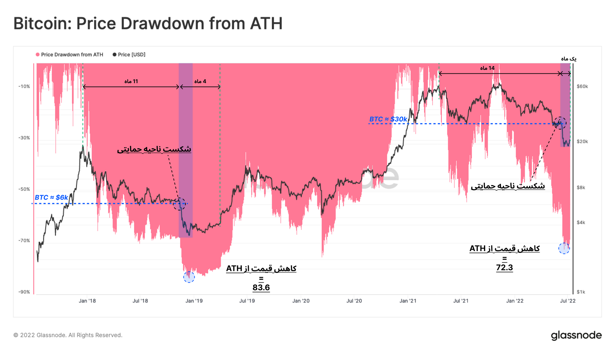 نمودار زیر نشان میدهد که قیمت از ATH چه مقدار کاهش پیدا کرده است. با توجه به این نمودار، فاز خرسی که اکنون در آن قرار داریم با آخر فاز خرسی ۲۰۱۸ بسیار شباهت دارد. در این بخش، این دو فاز خرسی را با یکدیگر مقایسه میکنیم: