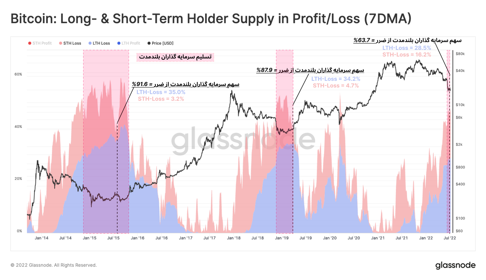در دو نمودار قبل میزان ضرری که سرمایهگذاران بلندمدت چه در هنگام خرج کردن بیتکوین های خود و چه در هنگام هولدکردن تحمل کردند، مشخص کردیم. اکنون در نمودار زیر به رنگ سبز مشخص شده است که در کدام بازه زمانی، سرمایه گذاران بلندمدت هم در خرج کردن بیتکوین های خود دچار ضرر شدند و هم در حالت هولد کردن بیتکوین ها، ضرر را تحمل کردند. در حال حاضر محدودهای که اکنون در آن قرار داریم، خبر از تسلیم قریبالوقوع سرمایهگذاران بلندمدت میدهد.