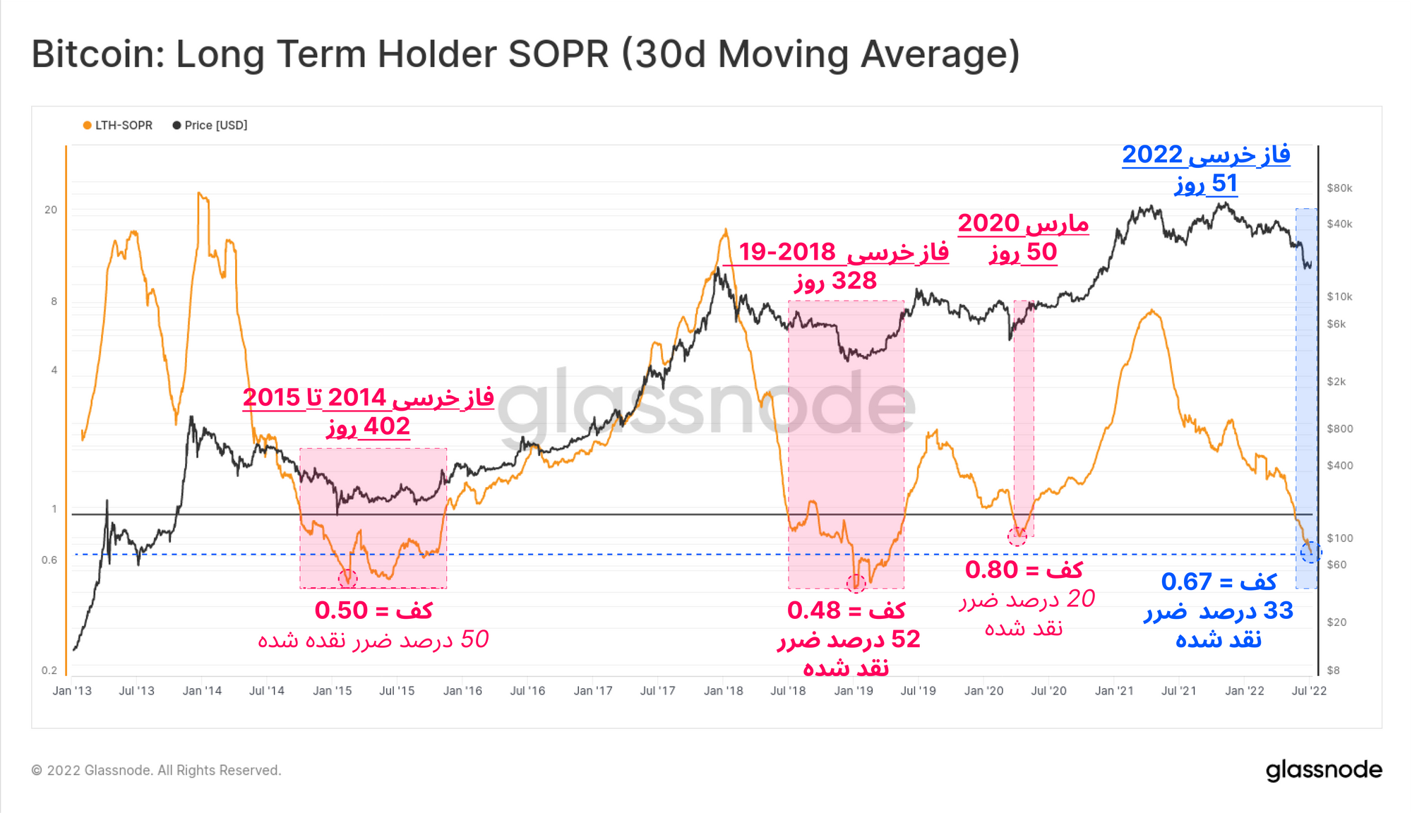 با توجه به اینکه میانگین قیمت خرید سرمایهگذاران بلندمدت ۲۲.۳ هزار دلار است و بیتکوینهای این سرمایهگذاران در ضرر خرج می شوند؛ بنابراین هر بیتکوین به طور میانگین در ۳۳ درصد ضرر نقد میشود، درحالی که قیمت تنها ۶ درصد از قیمت خرید آن ها پایین تر است. این موارد بیانگر این نکته است که افرادی که بیتکوین هایشان را در قیمت بالاتر خریداری کردند، اغلب آن ها اکنون بیتکوینهای خود را خرج میکنند و افرادی که از چرخه ۲۰۱۷ تا سال ۲۰۲۰ خریداری کردند، همچنان تسلیم نشدهاند.
