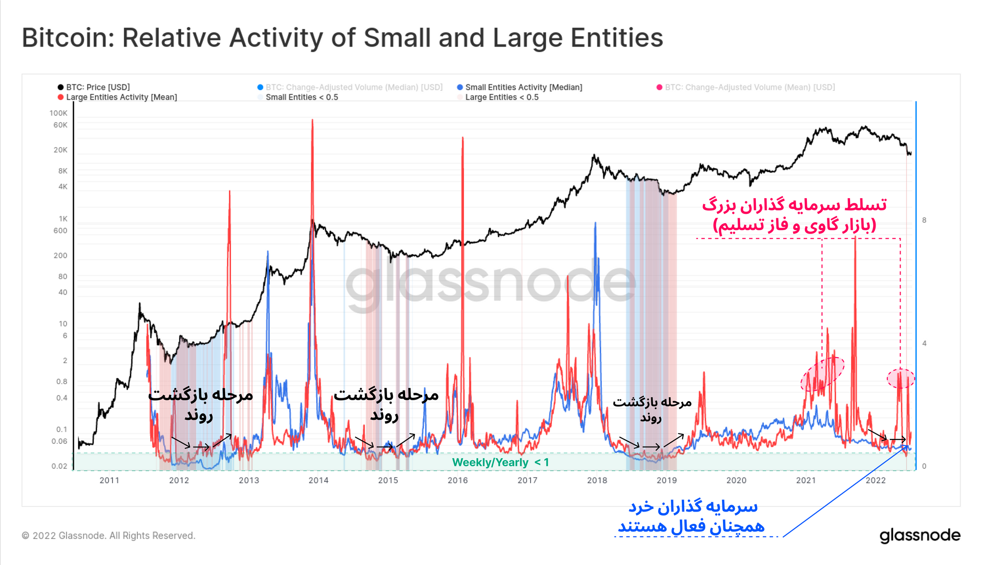 همچنین مشاهده میکنیم که سرمایهگذاران خرد بازار در این چرخه، نسبت به فازهای خرسی گذشته فعالتر هستند؛ اما هنوز میزان فعالیت آنها به کمترین حد ممکن نرسیده است که از آن انتظار بازگشت و تغییر روند داشته باشیم. برای اینکه ببینیم در میزان تقاضای دو قطب متفاوت بازار چه تغییراتی صورت خواهد گرفت، باید این معیار را رصد کنیم. نکته مهم این بخش میتواند این باشد که ما در مرحله تشکیل کف قیمتی هستیم اما هنوز زمان بازگشت و تغییر روند نرسیده است.