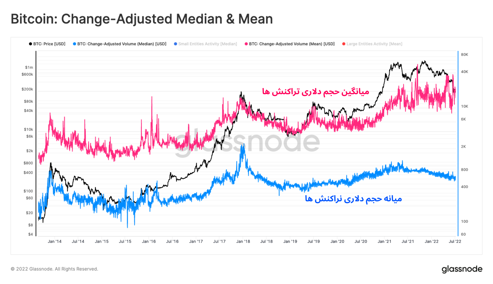 اگر تاریخچه تراکنش های بیتکوین را بررسی کنیم، خواهیم دید که میانگین حجم تراکنش های روزانه معمولا از میانه حجم روزانه بیشتر بوده است. به عبارت دیگر، تعداد تراکنشهایی که حجم کمتری دارند بسیار بیشتر از تراکنش هایی است که حجم سنگینی دارند. به عنوان مثال، تراکنشهایی چند هزار دلاری بسیاری در شبکه انجام می شود؛ اما حجم این تراکنش ها به نسبت کمتر است و از طرف دیگر تعداد تراکنش های چند میلیون دلاری بسیار کمتر است، اما حجم آن ها بالاتر است.