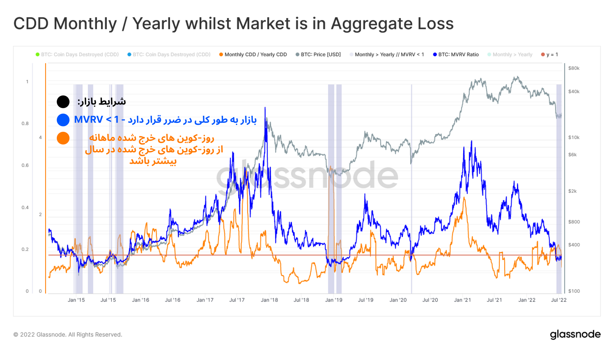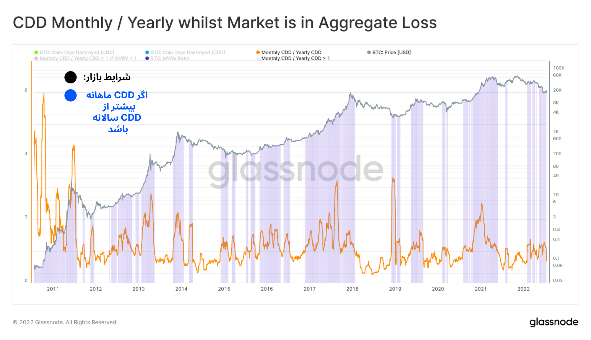 · زمانی که میزان CDD بالای عدد 1 باشد و به طور همزمان سرمایهگذاران به صورت میانگین در ضرر باشند ( MVRV بالای یک باشد)، بازار معمولاً در حالت تسلیم به سر میبرد.