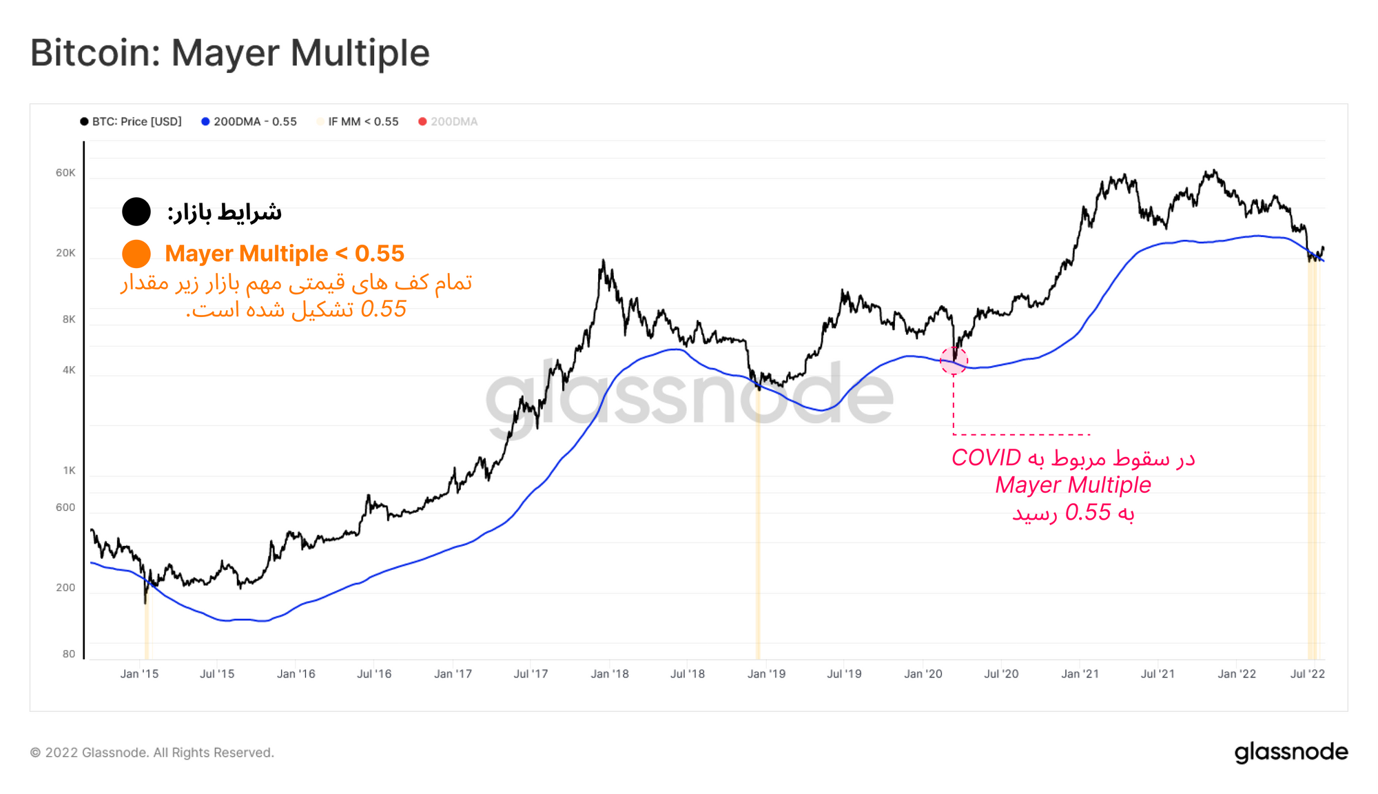 معیار Mayer Multiple میزان انحراف قیمت از Moving Average دویست روزه را مشخص میکند. در روشهای تحلیل تکنیکال از این معیار به طور گسترده برای تشخیص فاز صعودی و نزولی بازار استفاده شده است.