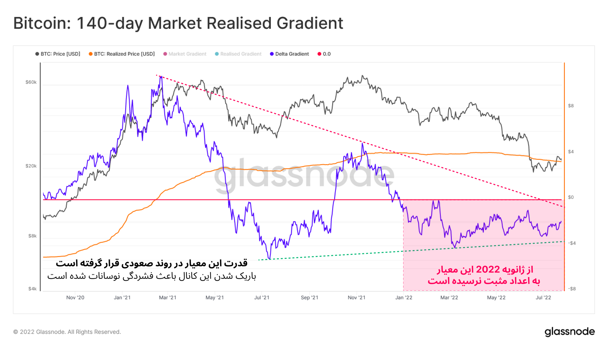 در تایمفریم ۱۴۰ روزه معیار MRGO، شدیدترین تغییر در قدرت سرمایه در این چرخه، در ماه می ۲۰۲۱ رخ داده است. با این حال در ماه ژوئن ۲۰۲۲، هنگام سقوط LUNA سنگینترین خروج سرمایه از بازار اتفاق افتاده است. بر اساس این شواهد، با دیدگاه کلان، شدت خروج از سرمایه تا حدودی در حال کاهش پیدا کردن است و نشان از ضعف فروشندگان بازار و ثبات نسبی بازار دارد.