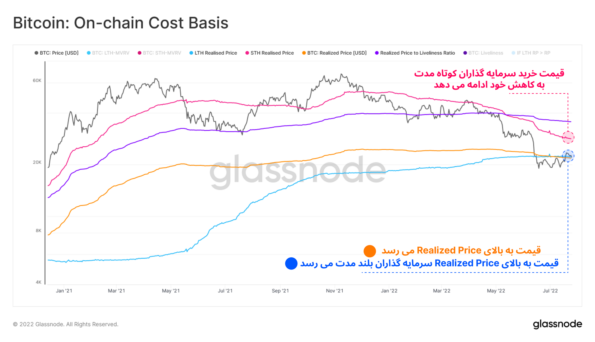 برای ارزیابی قدرت نسبی قیمت ، معیارهای قیمت خرید سرمایهگذاران کوتاهمدت (Realized Price STH)، بلندمدت (Realized Price LTH) و در نهایت تمام سرمایهگذاران (Realized Price) استفاده میشوند. برای یافتن قیمت عادلانه بیتکوین میتوانیم معیار Realized Price را به نسبت Liveliness Ratio ، در نظر بگیریم (RPLR)