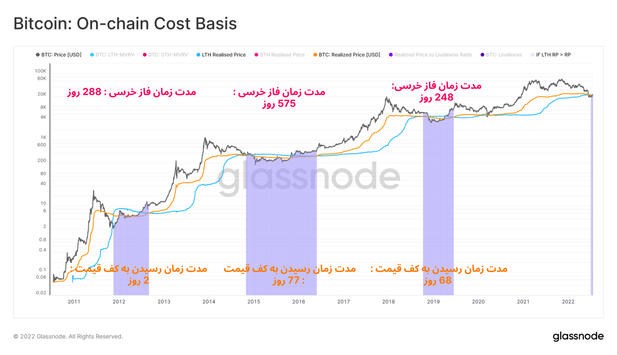 مدت زمان فازهای خرسی قبلی بین ۲۴۸ تا ۵۷۵ روز متغیر بوده است. اگر فاز خرسی را با قرار گرفتن قیمت خرید سرمایهگذاران بلندمدت (Realized Price LTH) در بالای قیمت خرید تمام سرمایهگذاران (Realized Price) در نظر بگیریم؛ اکنون تنها ۱۷ روز از فاز خرسی گذشته است که نسبت به فاز های خرسی قبلی بسیار کوتاه است.