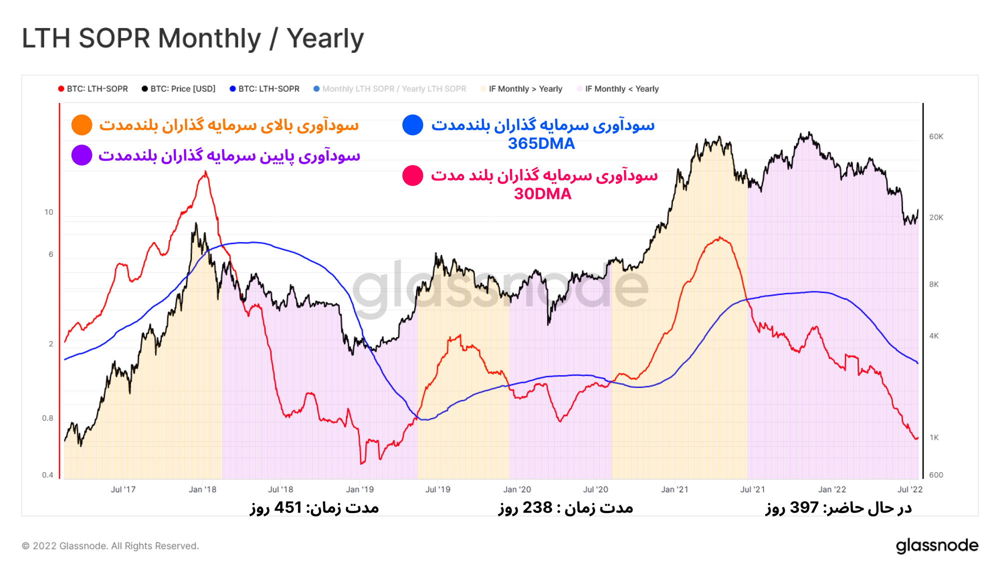 اکنون با توجه به این نمودار مشاهده میکنیم که سرمایهگذاران بلندمدت حجم بسیاری از بیتکوینهای خود را در حالی خرج میکنند که بازار به طور میانگین در ضرر قرار گرفته است؛ بنابراین این سرمایهگذاران بین ماه می تا جولای تسلیم عمیقی را تجربه کردند.