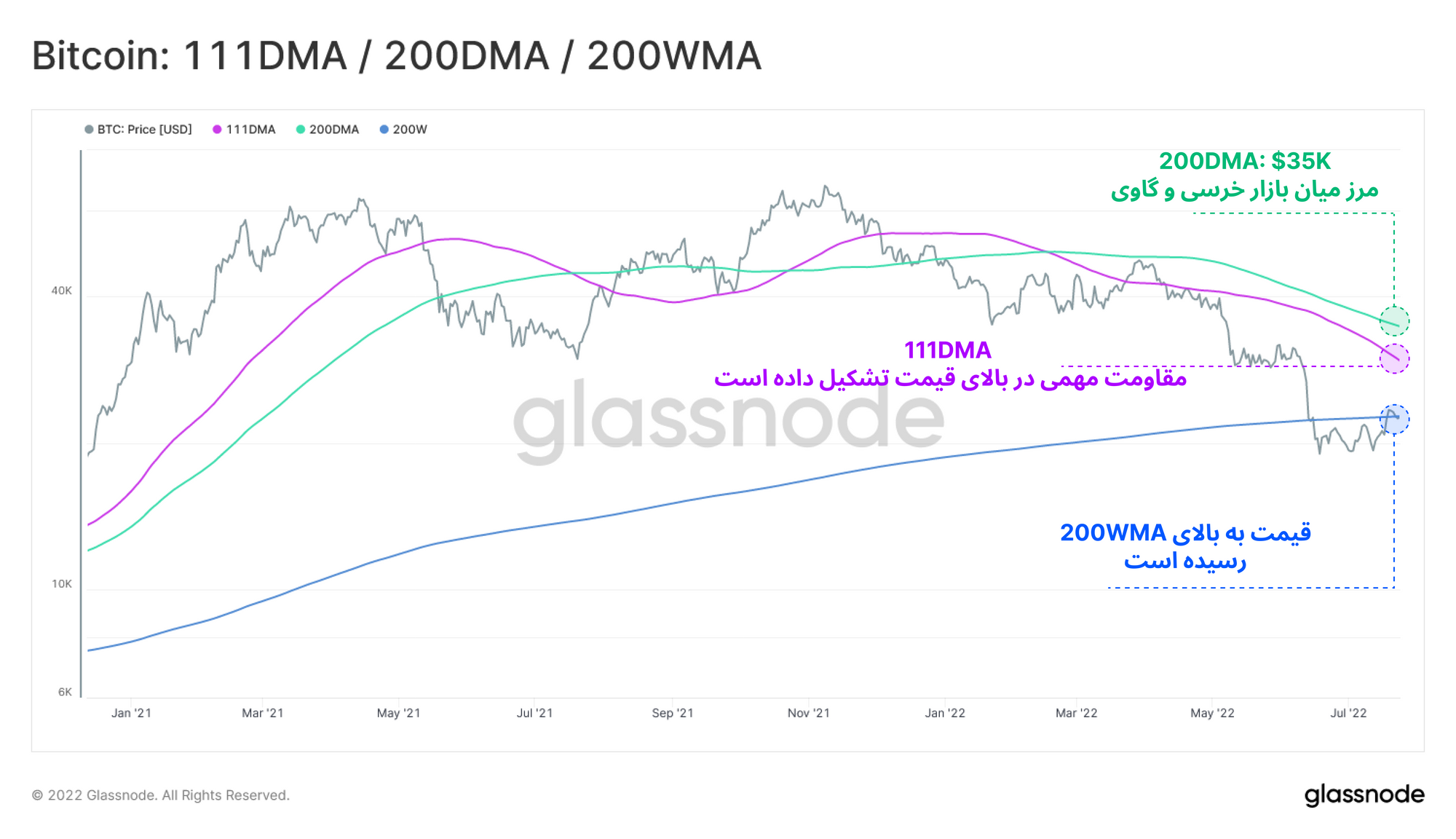 · معیار Moving Average دویست روزه که اکنون در نزدیکی ۳۵ هزار دلار قرار گرفته ، مانند مرزی میان ناحیه فاز خرسی و فاز صعودی عمل میکند.