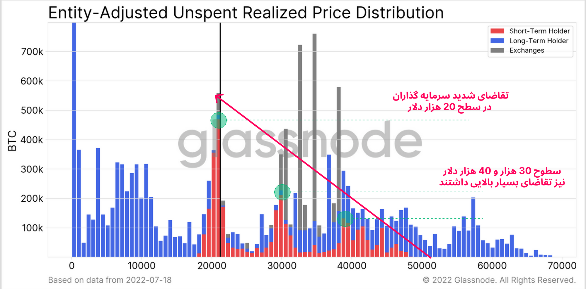 · در سطح قیمتی ۲۰ هزار دلار، تقاضا برای ورود به بازار به شدت افزایش یافت و بخش عمدهای از بیتکوینهای جابه جا شده اخیراً وارد بازار شده اند.همچنین مشاهده میکنیم که حدود ۹۰۰ هزار بیتکوین در این سطح بین سرمایهگذاران جابه جا شده و فعلا مقام دوم سنگینترین حجم جابه جایی میان افراد، متعلق به سطح ۲۰ هزار دلار است؛ زیرا در این سطح بسیاری از سرمایهگذاران بیتکوینهای خود را جابهجا کردهاند.