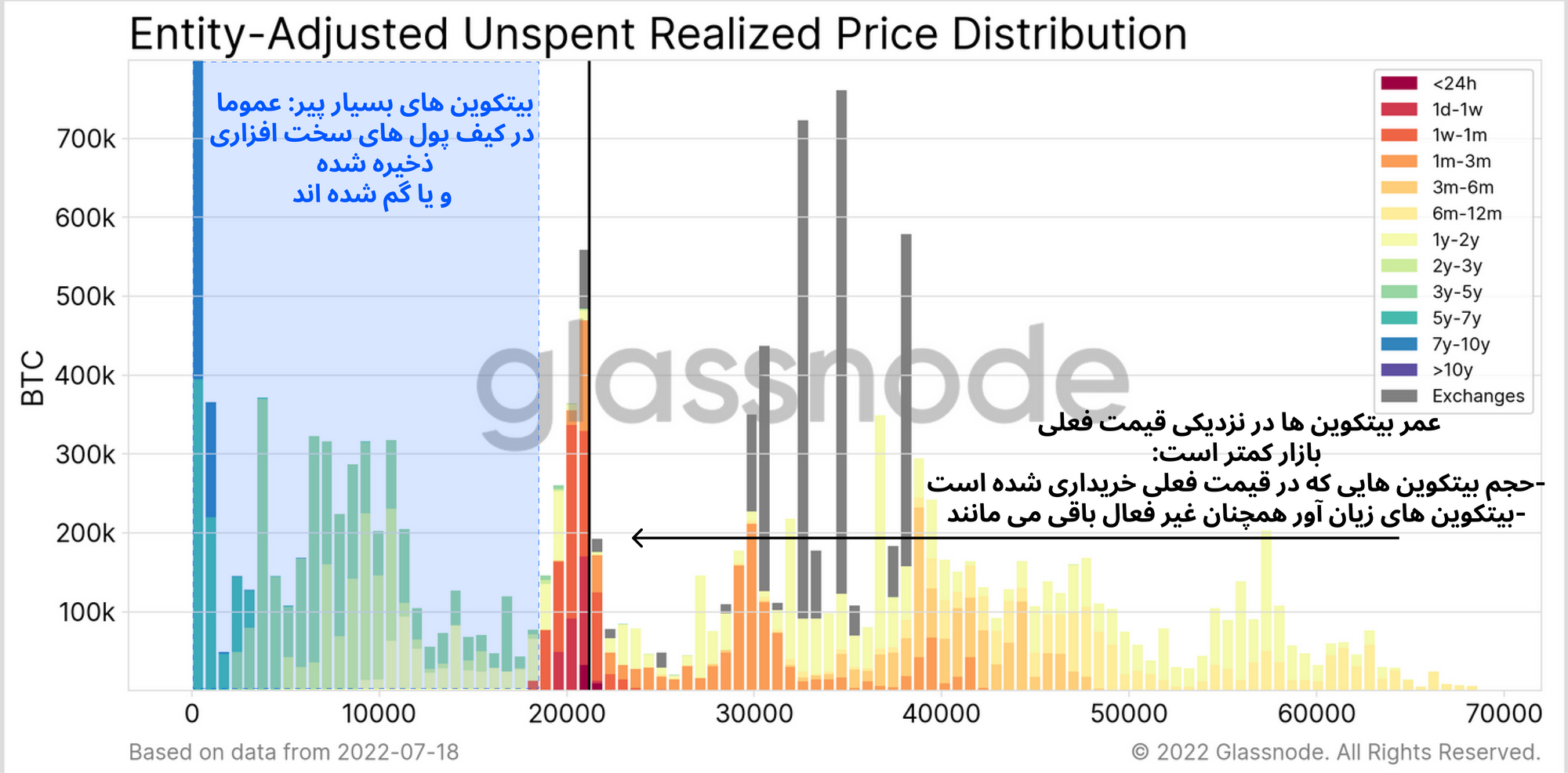 با توجه به نمودار میتوان گفت که با افت قیمت، سرمایهگذارانی که دارای بیتکوینهای پیرتری هستند، بیشتر از دیگران سرمایه خود را خرج کردند.