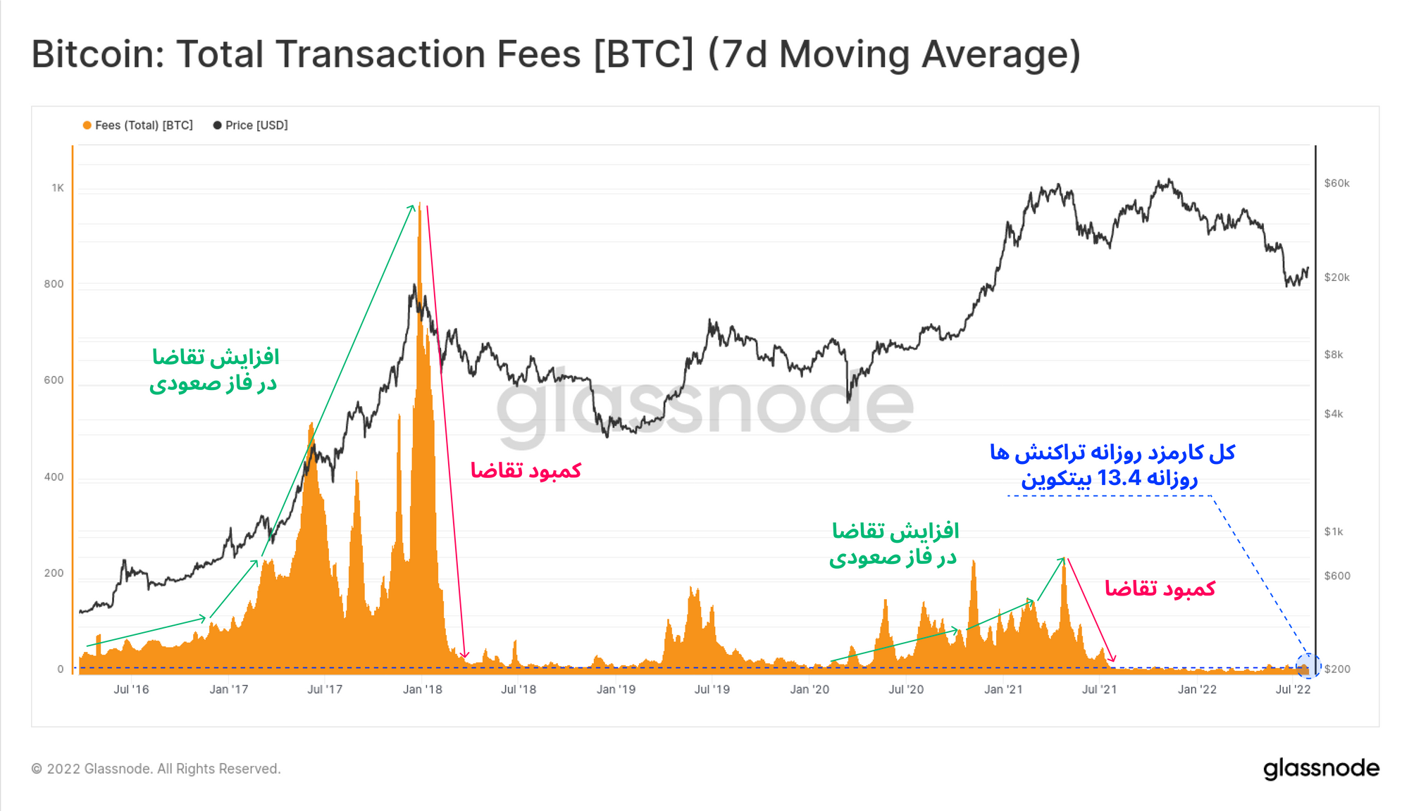 به علت کاهش تقاضا برای انجام تراکنش در شبکه، میزان کارمزد بیتکوینی تراکنشها در نمودار زیر، صرفاً با ۱۳.۴ بیتکوین در روز، در پایینترین مقدار خود قرار دارد( رنگ آبی).