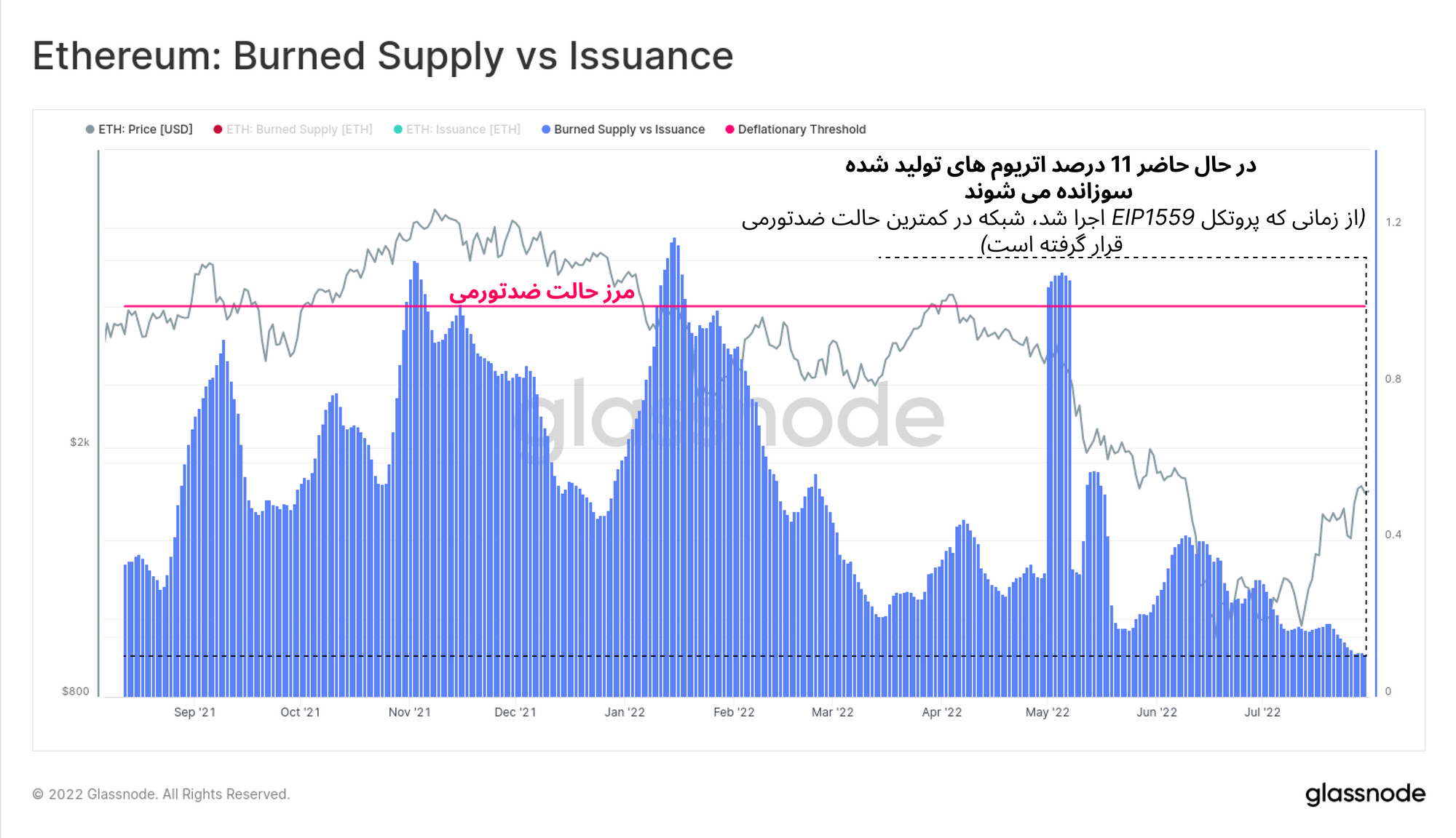 نمودار زیر نشان میدهد که چند درصد از میزان اتریومی که تولید شده، سوزانده میشود. با مشاهده نمودار خواهیم دید که میزان سوزاندهشدن اتریوم نسبت به مکانیزم ضدتورمی EIP1559 ، به پایینترین حد خود رسیده است. تمام اتریومی که اکنون سوزانده میشود، ۱۱ درصد تمام میزان اتریومی است که تولید می شود. اتریوم در شرایطی مشابه تنها سه بار در حالت ضد تورمی قرار گرفته، یا به عبارتی میزان سوزانده شدن اتریوم بیشتر از میزان تولید آن بوده است.