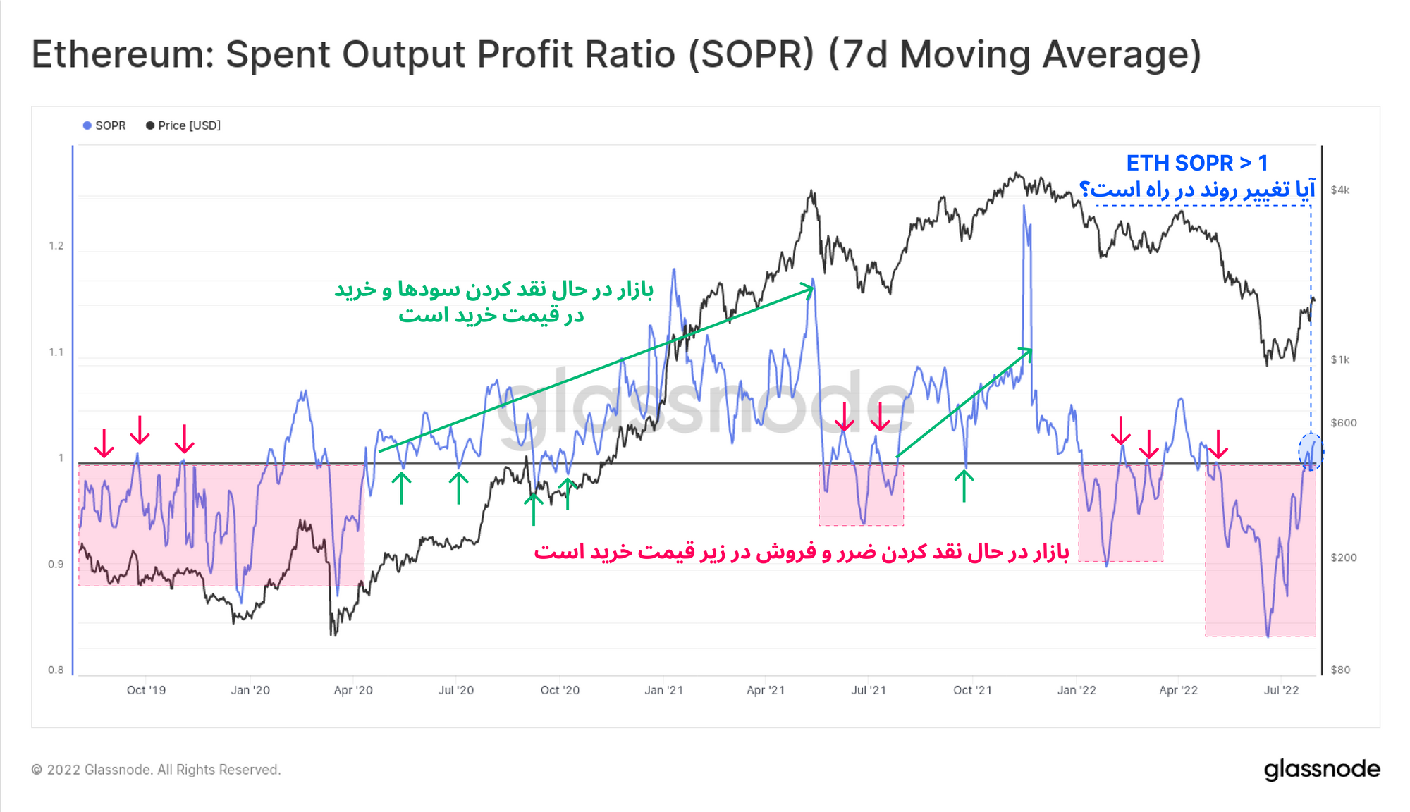 🔔پیشنهاد تنظیم هشدار : در صورتی که SOPR (7SMA) به پایین عدد ۱ برسد، به معنای کاهش دوباره سودآوری و احتمال افت بیشتر اتریوم خواهد بود.