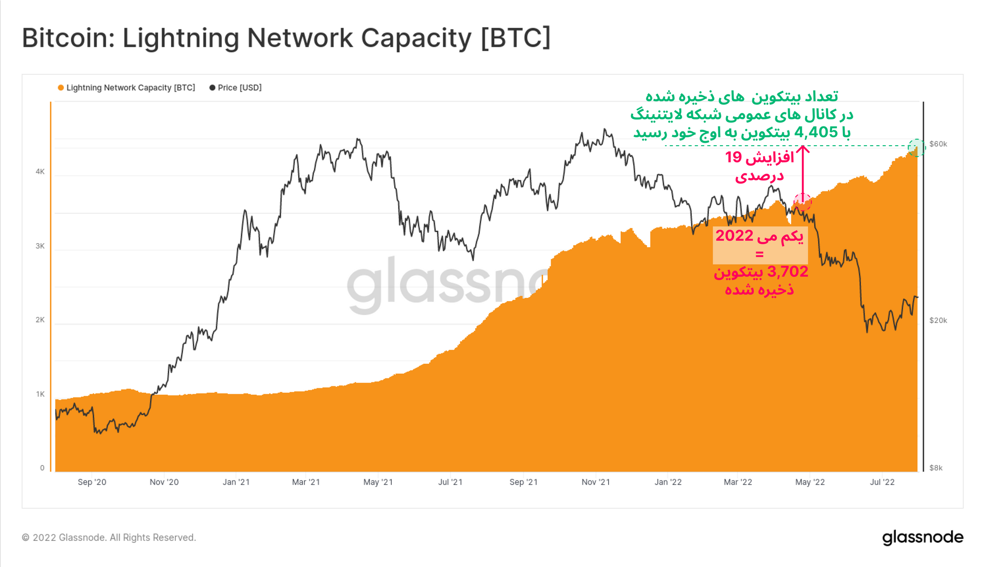 از طرف دیگر، حجم بیتکوینهای قفلشده در کانالهای عمومی شبکه لایتنینگ به صورت روزافزون به بالاترین سطح خود میرسد. تعداد کل بیتکوینهای قفل شده ۴,۴۰۵ است که در دو ماه اخیر، با وجود شرایط بحرانی اقتصادی و سیاسی، ۱۹ درصد افزایش پیدا کرده است.