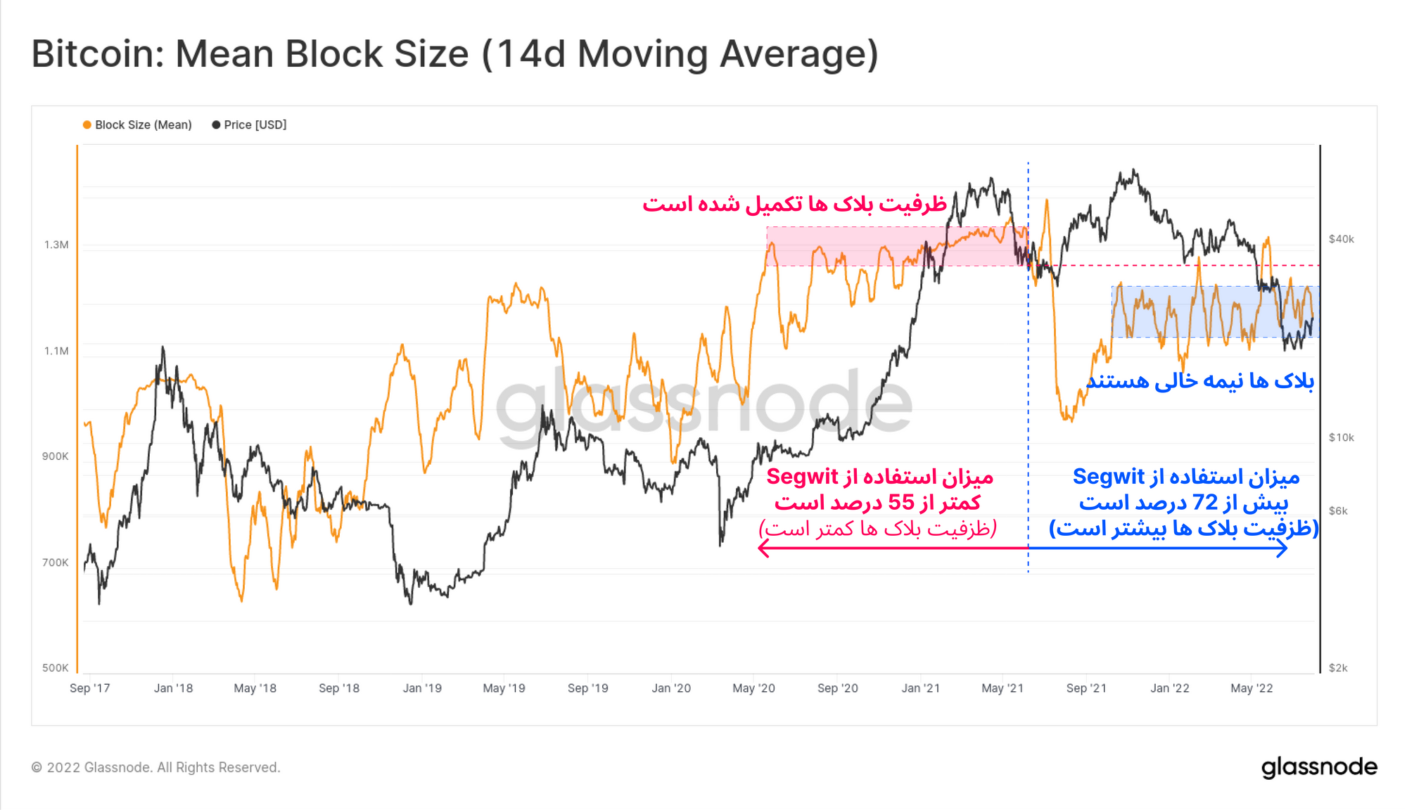 علاوه بر این ، Segwit به عنوان یکی از آپدیتهای فنی بیتکوین وظیفهی استفاده حداکثری از فضای بلاکهای بیتکوین را دارد. قبل از سال ۲۰۲۱، میزان استفاده از Segwitکمتر از ۵۵ درصد بود، به عبارتی حداکثر ظرفیت تراکنشها نسبت به ظرفیت اکنون آنها بسیار کمتر بود. در حال حاضر میزان استفاده از تکنولوژی Segwitبه ۷۲ درصد رسیده و فضای هر بلاک افزایش پیدا کرده است؛ اما در این صورت نیز فضای کنونی بلاکها کاملا پر نشده و نسبت به ظرفیت بلاک ها در ماه می ۲۰۲۱ کمتر است.