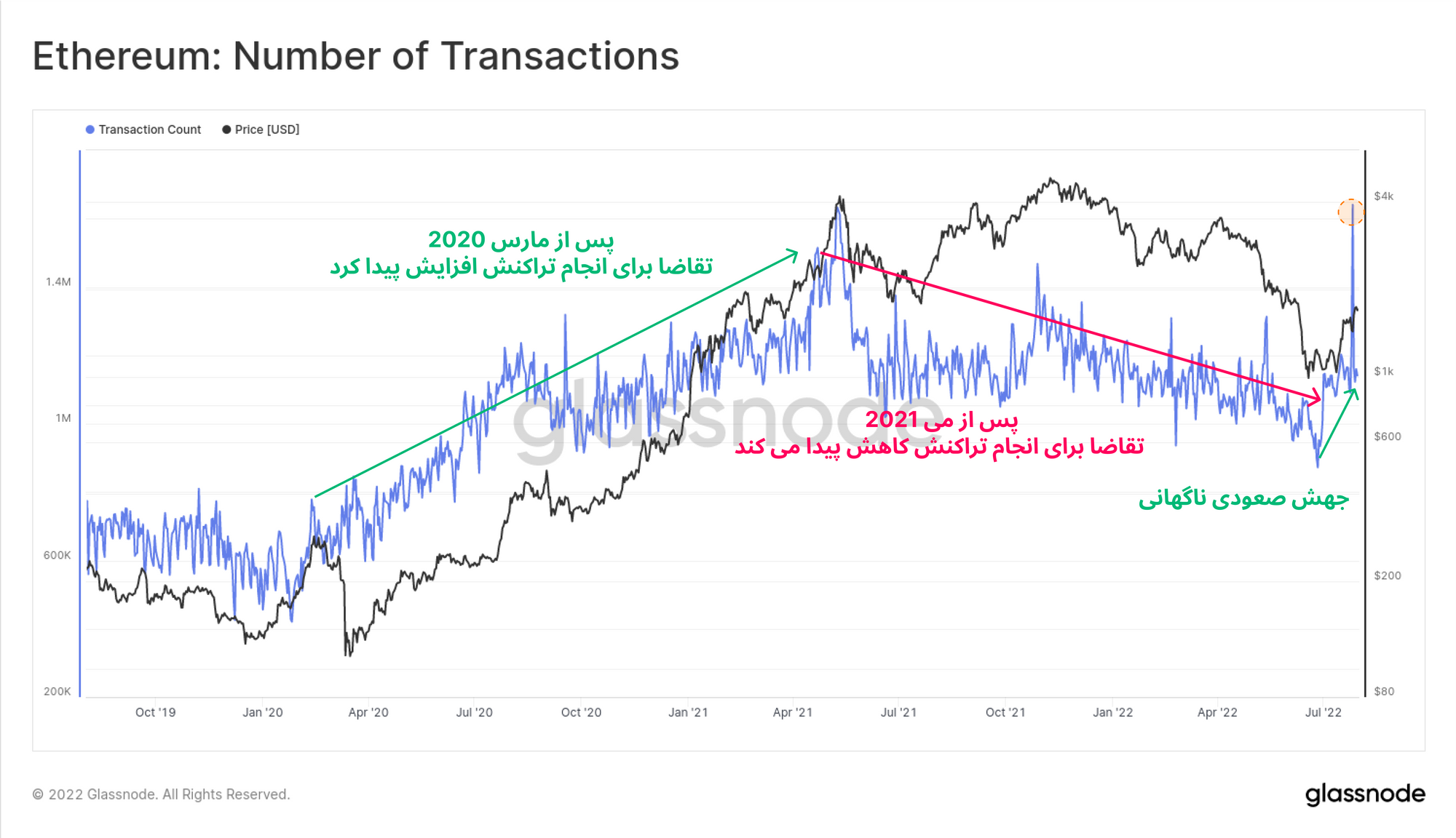 از ماه می ۲۰۲۱، میزان تقاضا برای تراکنشهای اتریوم در افت تدریجی قرار داشت و تنها در چندین هفته اخیر، از خود جهشی قدرتمند نشان داده است. این روند صعودی میتواند در آیندهٰ سازنده باشد و باید به آن توجه داشت.