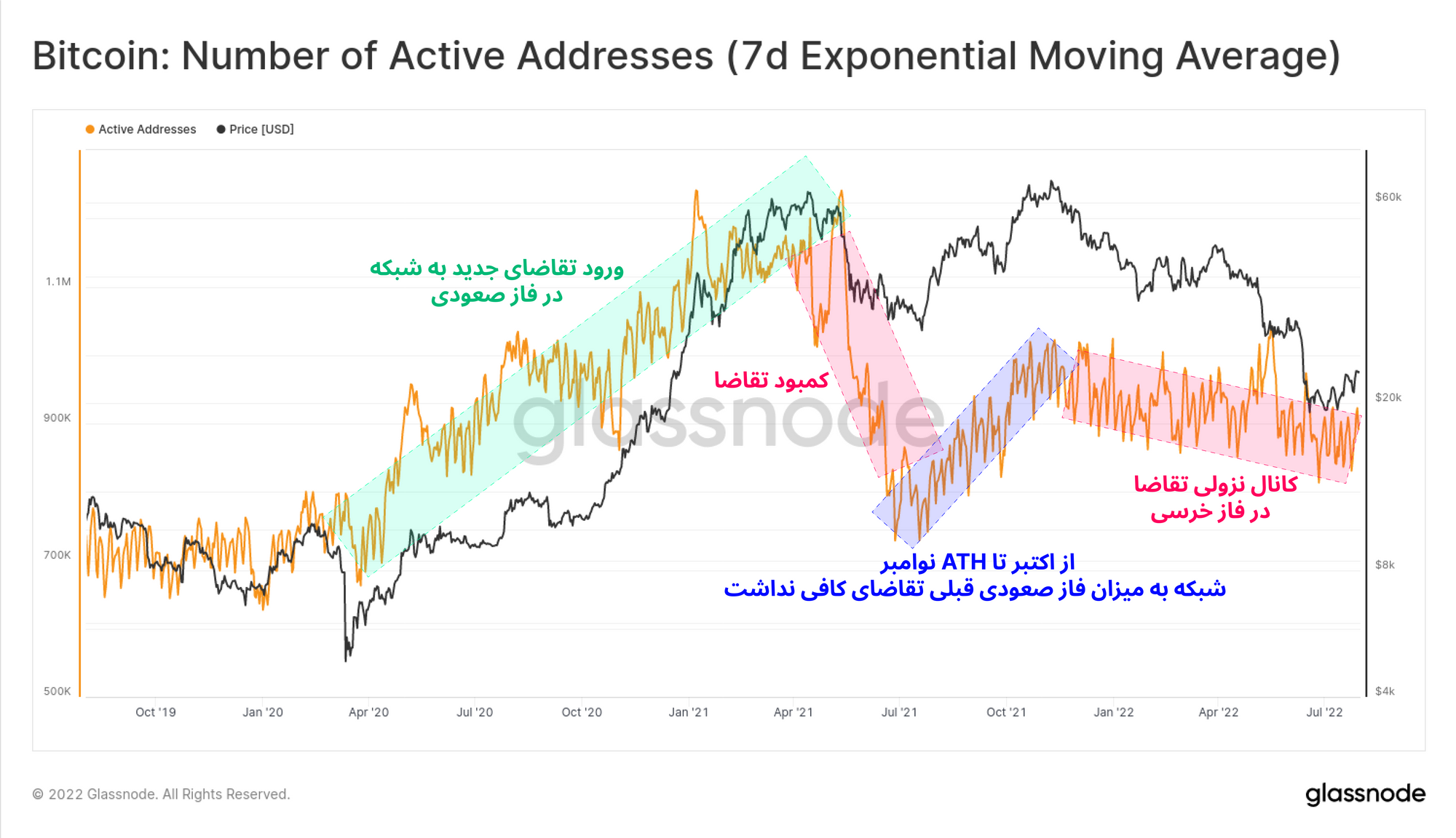 همچنین به کانال صعودی اکتبر تا نوامبر توجه کنید. همانطور که مشاهده میکنید، با اینکه قیمت بار دیگر به ATH رسید، اما تعداد آدرسهای فعال در این بازه زمانی نسبت به ATH قبلی بسیار کاهش پیدا کرده و میزان تقاضای کافی به شبکه وارد نشده است. به استثنای چندین جهش صعودی کوتاهمدت تعداد آدرسهای فعال در فاز تسلیم، در حال حاضر هنوز میزان تقاضای قابل توجه و مهمی در شبکه مشاهده نشده است.