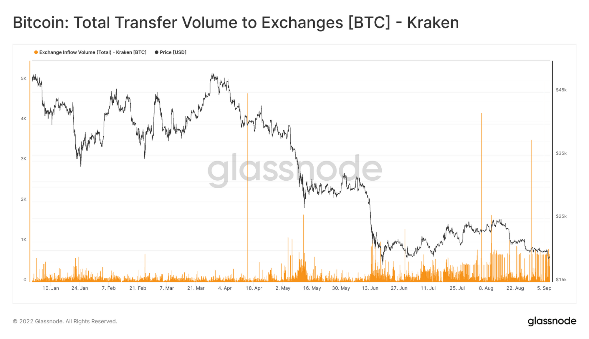 بنابراین، جهش ناگهانی که اخیراً در معیار LTH-SOPR شکل گرفته بیشتر به این سه تراکنش بزرگ مرتبط است، زیرا با جابهجا شدن این بیتکوینهای قدیمی که در سال ۲۰۱۳ خریداری شده بودند، سود بسیاری نقد شد. نمودار زیر دو تراکنشی را که به صرافی Kraken واریز شدند نشان میدهد. این دو تراکنش با ارسال مستقیم ۸.۵ هزار بیتکوین به صرافی Kraken در مجموع ۱۶۳.۴۸ میلیون دلار سود محقق کردند.