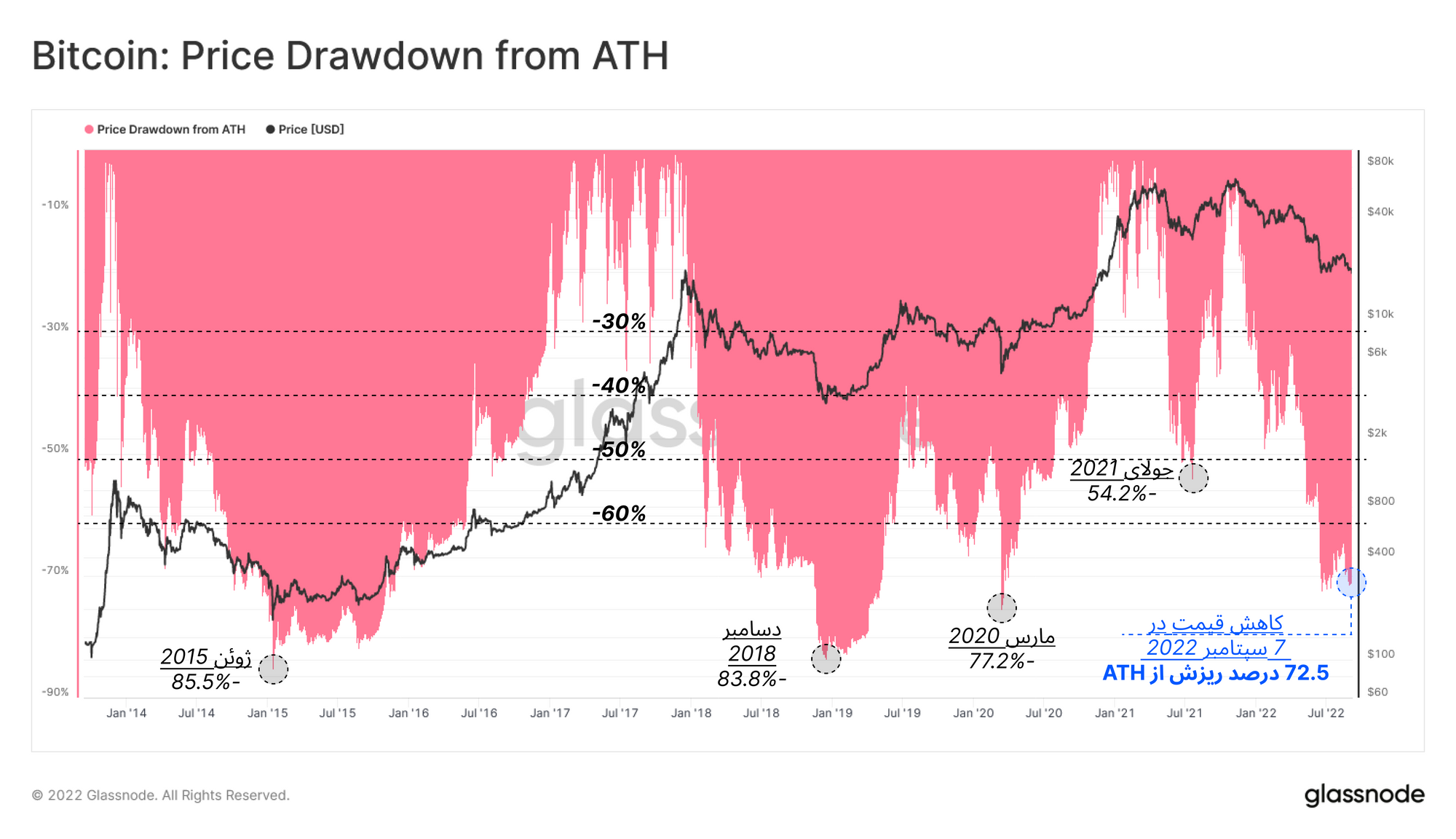 از ATH نوامبر ۲۰۲۱، بیتکوین تا کنون به مدت ۱۰ ماه مداوم در فار خرسی قرار داشته است. در این هفته قیمت بیتکوین تا ۱۸,۶۴۹ دلار پیش رفت و با ۷۲.۵ درصد کاهش قیمت از سقف قیمتی، دومین کف قیمتی مهم را در این فاز خرسی تشکیل داد. این میزان کاهش قیمت هنوز به اندازه کاهش قیمت در چرخههای قبل قابلتوجه نیست؛ زیرا در سالهای ۲۰۱۵، ۲۰۱۸ و ۲۰۲۰، قیمت از ATH بیش از ۷۷ درصد کاهش داشته است.