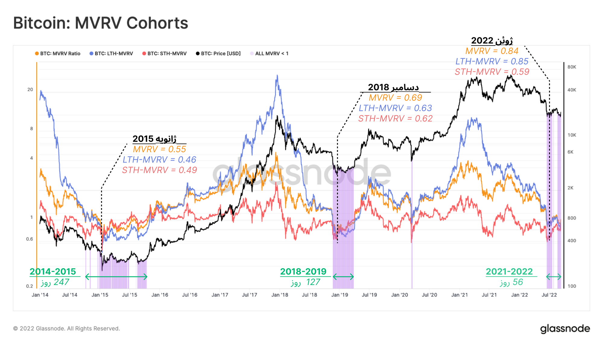 اگر MVRVسرمایهگذاران کوتاهمدت را در بازار فعلی با دسامبر ۲۰۱۸ مقایسه کنیم، خواهیم دید که این معیار در این فاز نسبت به سال ۲۰۱۸ به مقدار پایینتری رسیده است و این بیانگیر این نکته است که مخصوصاً سرمایهگذاران کوتاهمدت ضرر مالی بسیاری را تجربه کردند.