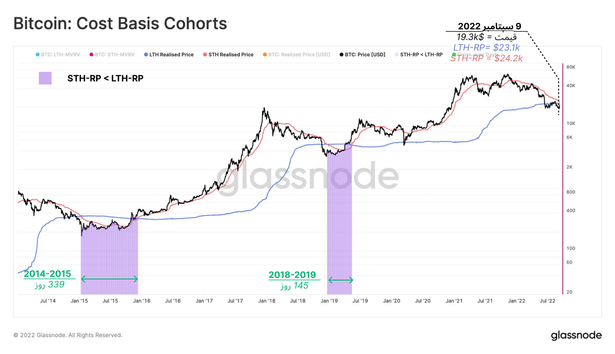 اکنون میتوانیم Realized Price (میانگین قیمت خرید و یا جابهجایی) تمام سرمایهگذاران کوتاهمدت 🔴 را با Realized Price سرمایهگذاران بلندمدت 🔵 مقایسه کنیم. در فازهای خرسی، کاهش مدام قیمت باعث شده تا Realized Price سرمایهگذاران کوتاهمدت به زیر Realized Price سرمایهگذاران بلندمدت برسد 🟪.