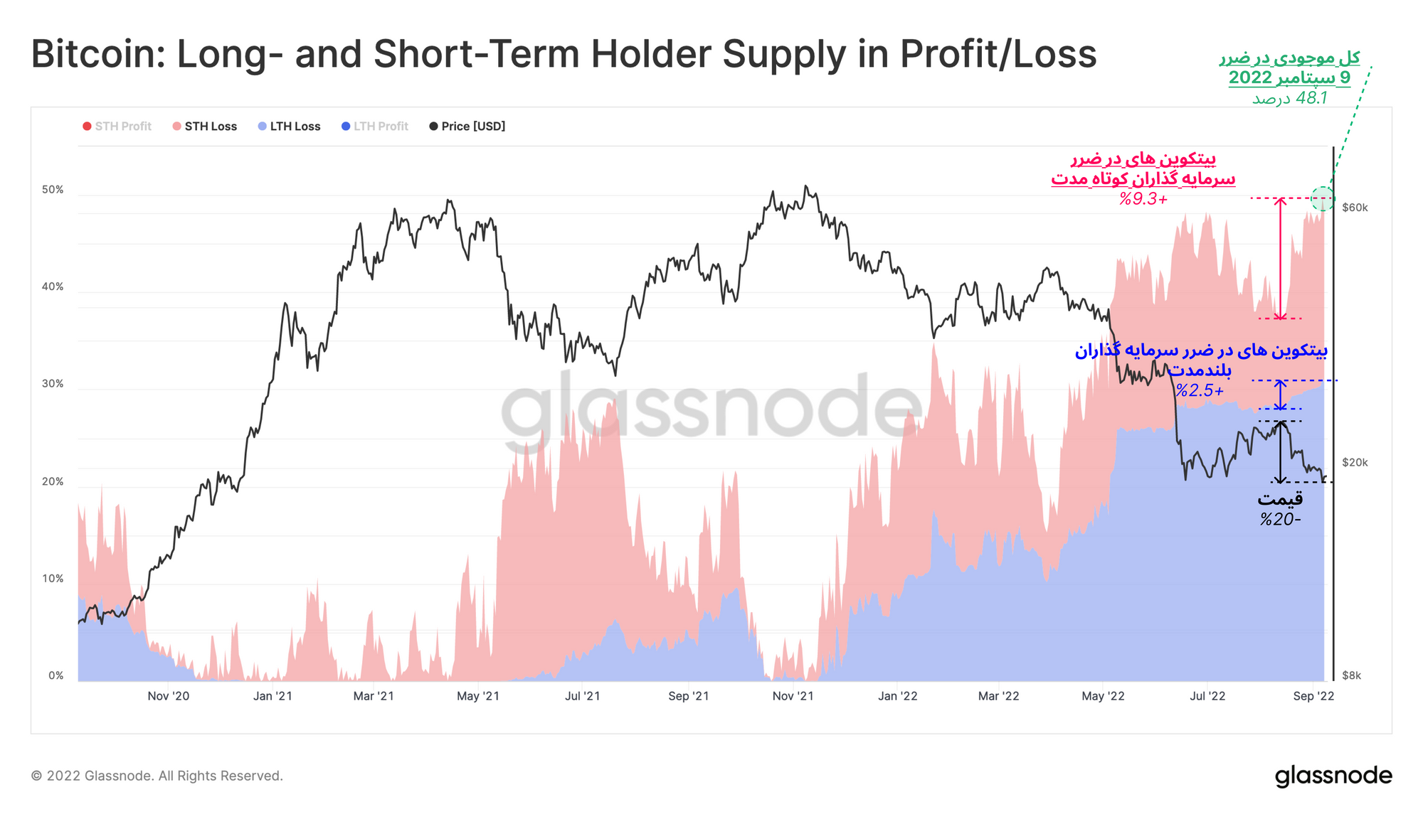 از اواسط ماه اوت میزان کل بیتکوینهایی که در ضرر قرار گرفته بودند، از ۱۱.۸ درصد به ۴۸.۱ درصد رسید. طبق نمودار زیر سهم سرمایهگذاران کوتاهمدت از این ضرر ۹.۳ 🟥 درصد و سهم سرمایهگذاران بلندمدت ۲.۵ 🟦 درصد است.