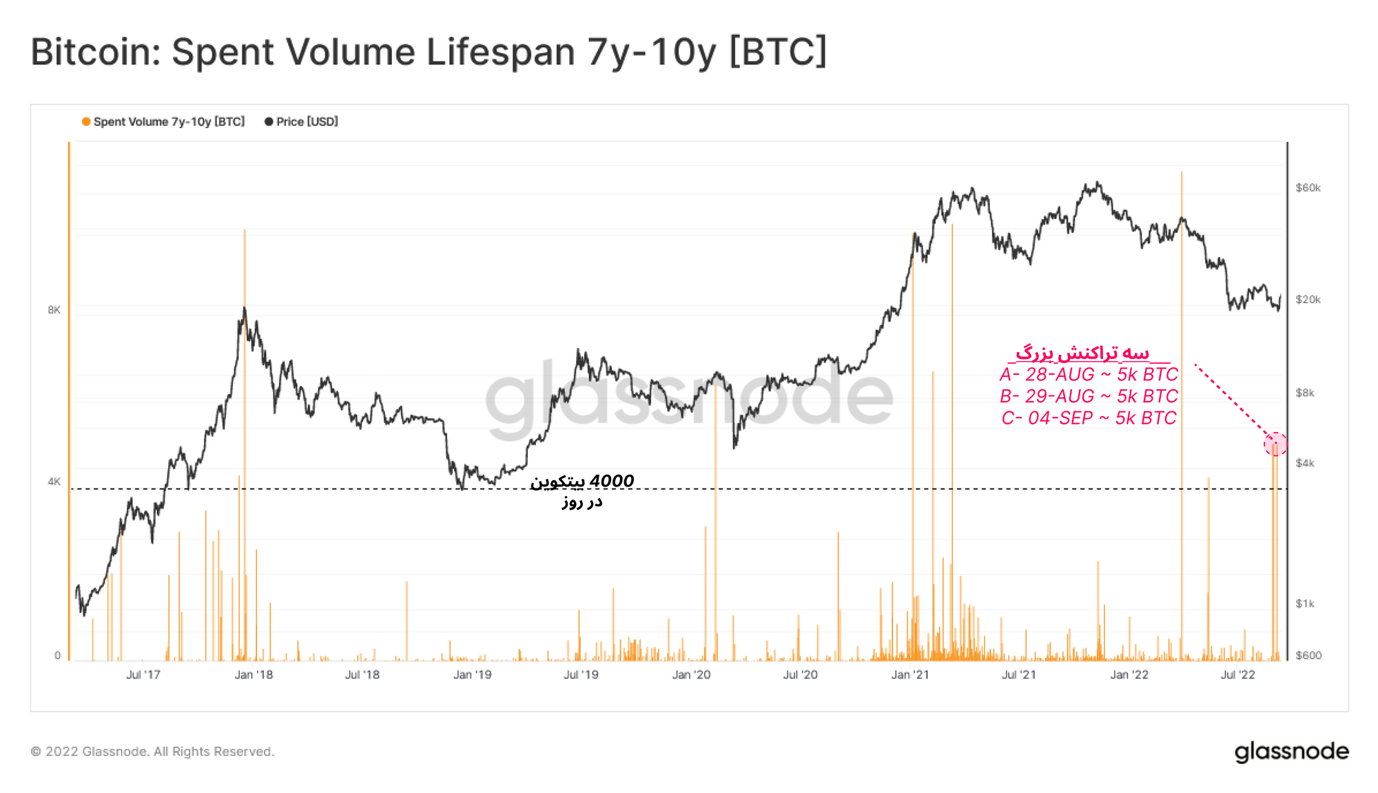 در ابتدا برای نشاندادن اهمیت جهش صعودی در سود نقدشده معاملات سرمایهگذاران بلندمدت، باید به نمودار زیر توجه کنیم. این نمودار حجم بیتکوینهای خرج شده بین ۷ تا ۱۰ سال را نشان میدهد. بسیار جالب است که در کل تاریخ بیتکوین تنها ۱۱ مورد از خرجشدن بیتکوینهای ۷ تا ۱۰ سال به حجم بالای ۴ هزار بیتکوین وجود دارد که سه مورد آن در دو هفته اخیر رخ دادند.