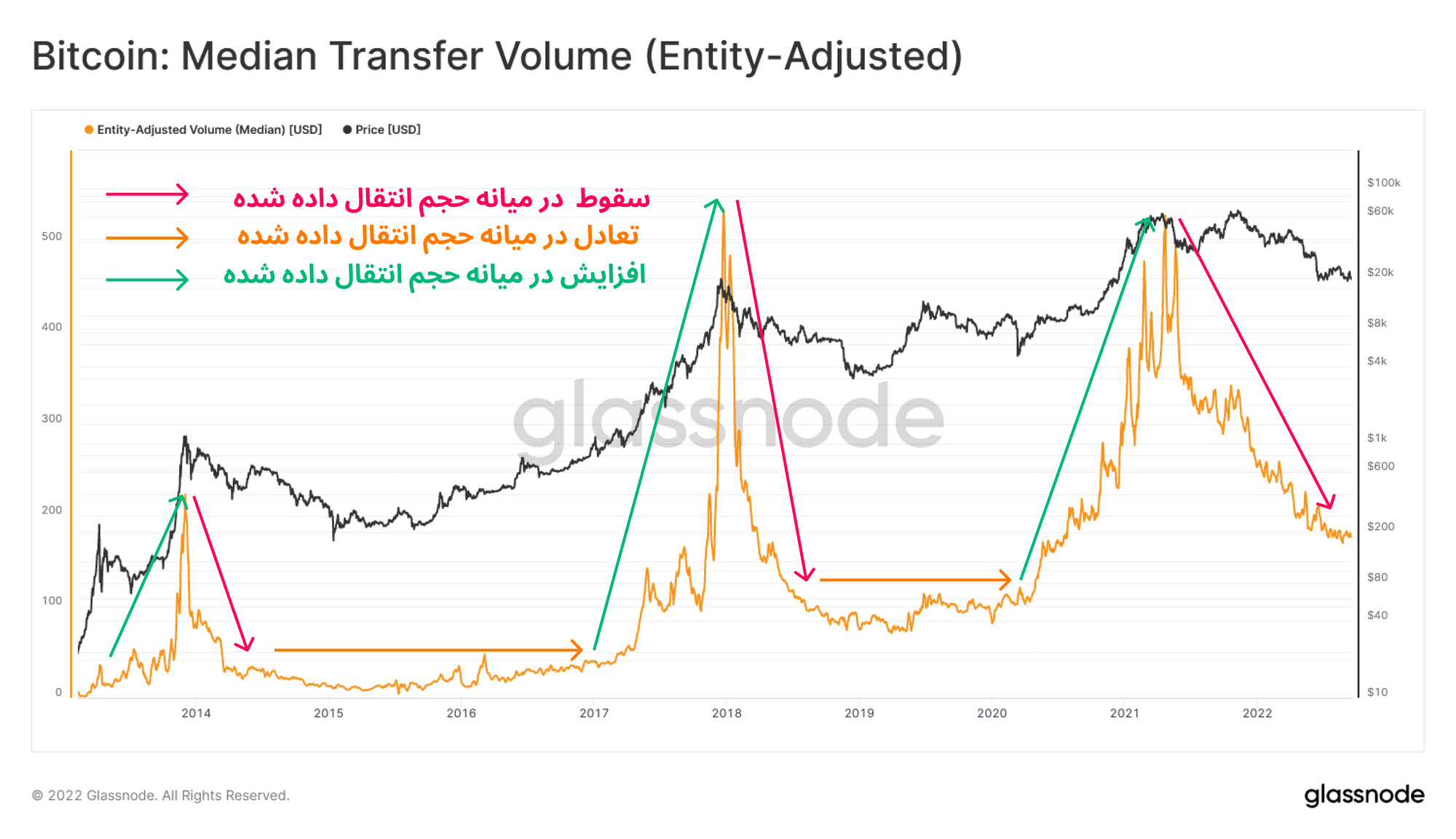 · میانه حجم انتقالداده شده خنثی معمولا پس از هجوم کاربران خرد به شبکه رخ میدهد و به این معناست که تعادلی میان کابران باقیمانده شبکه ایجاد شده است ( هولدرها، معاملهگران حرفهای، سرمایههای هنگفت).