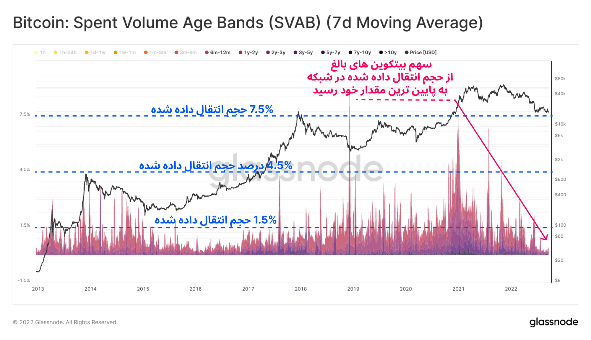 در این نمودار تنها وضعیت بیتکوینهای پیرتر از ۶ ماه در نظر گرفته شده است که در قیمتهای فعلی بسیار کمتر از همیشه خرج میشوند. از ژانویه ۲۰۲۱ حجم بیتکوینهای خرجشده پیر ۸ درصد کل حجم خرج شده را تشکیل میداد اما اکنون این مقدار ۰.۴ درصد رسیده است.