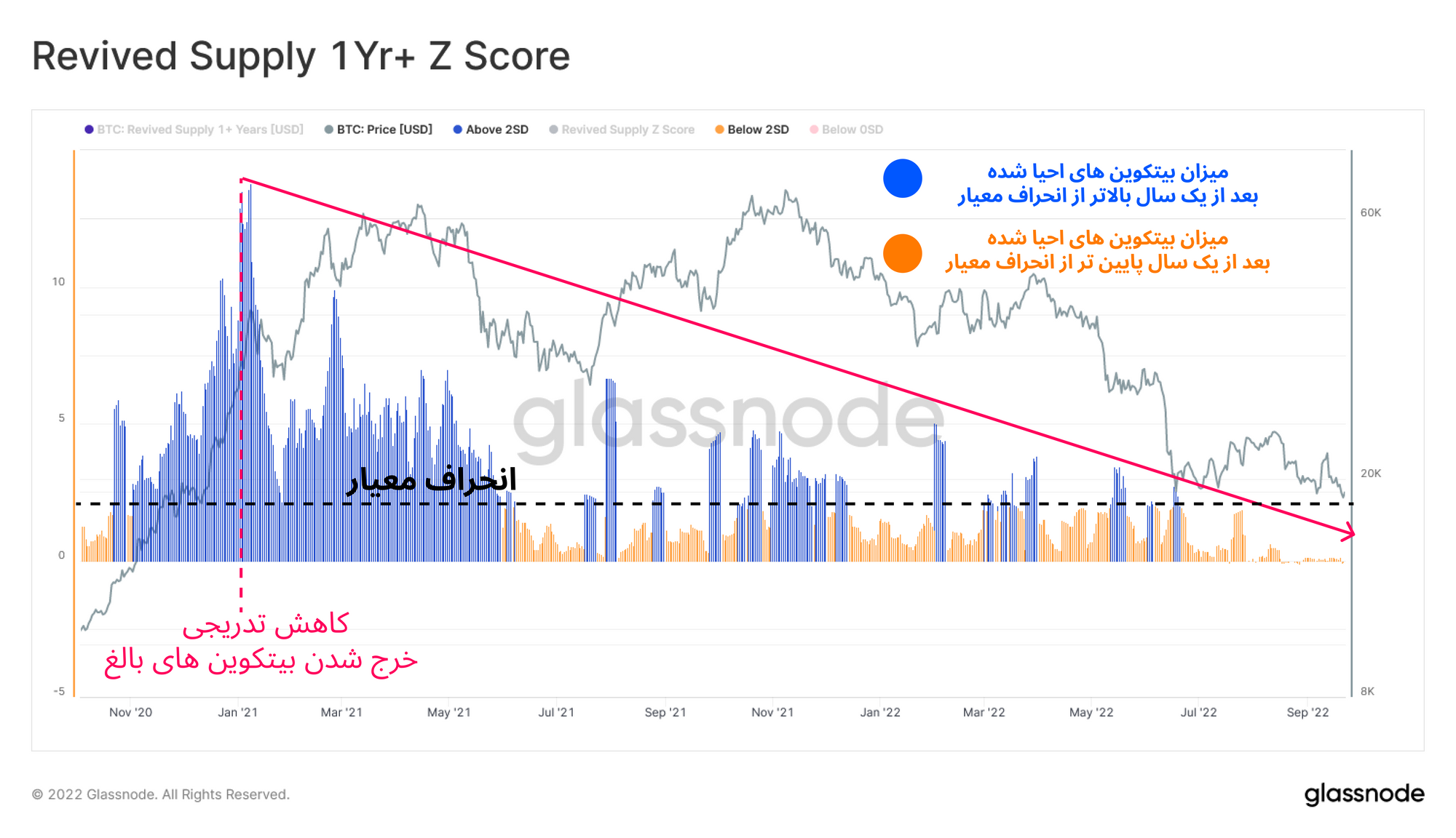 · بالای انحراف معیار 🔵 به این معناست که حجم بسیاری از بیتکوینها، پس از یک سال دوباره احیاء شدند.