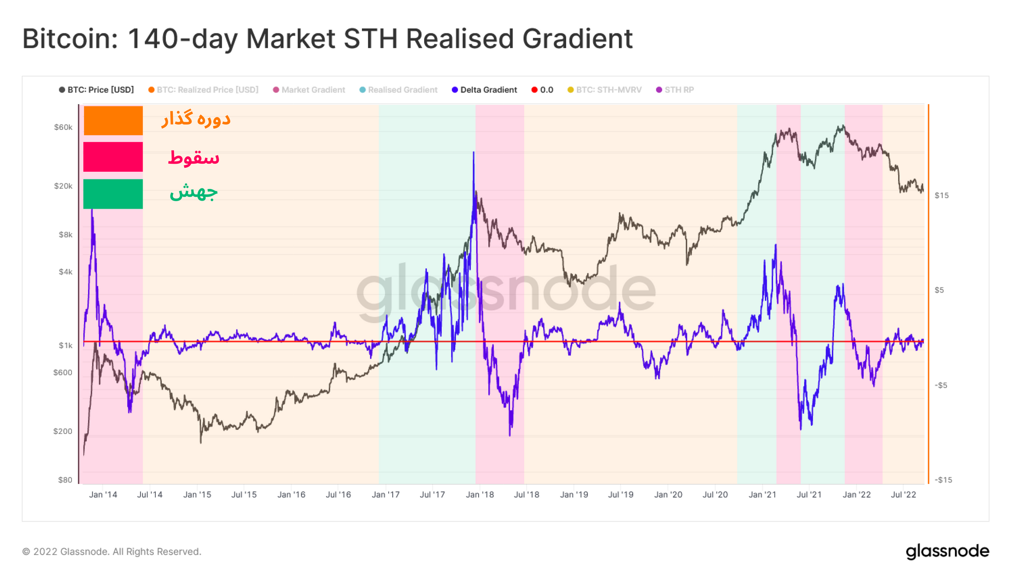 برای ارزیابی بیشتر رفتار سرمایهگذاران کوتاهمدت، معیار STH-MRGO را بررسی میکنیم. این معیار شدت تغییرات میان بیتکوینهایی که به صورت هیجانی و بیتکوینهایی که به صورت بلندمدت وارد سرمایه هولدرهای کوتاهمدت میشوند، مشخص میکند. برای این معیار نیز سه فاز مشخص شده است: