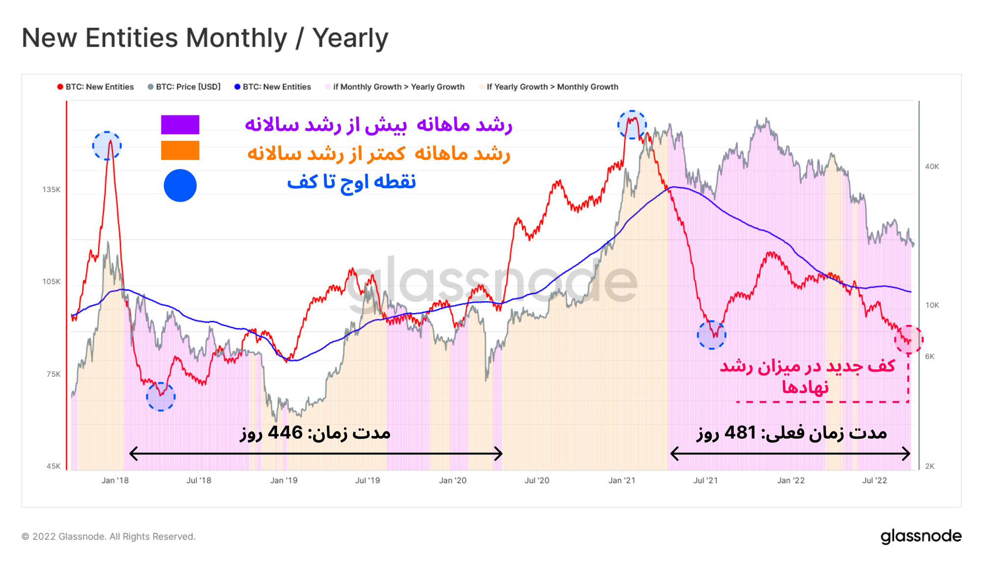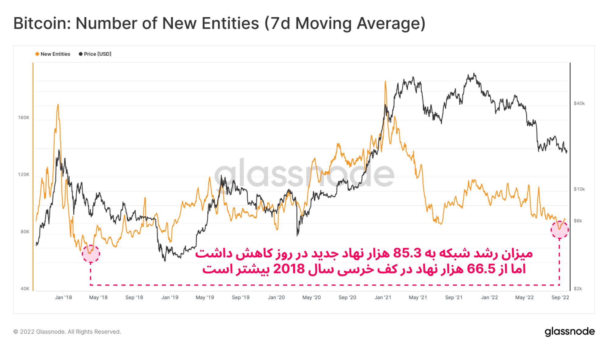 کاهش رشد شبکه در چرخه فعلی از ۵۳۳ روز پیش آغاز شد و صرفاً در ماه مارس تا آوریل ۲۰۲۲ به مدت ۵۲ روز از کاهش ایستاد. در فاز خرسی ۲۰۱۸ تا ۲۰۲۰ چندین نمونه از بازیابی کاربرد شبکه را مخصوصاً در اواسط رالی ۲۰۱۹ تا قیمت ۱۴ هزار دلار، میتوان مشاهده کرد.