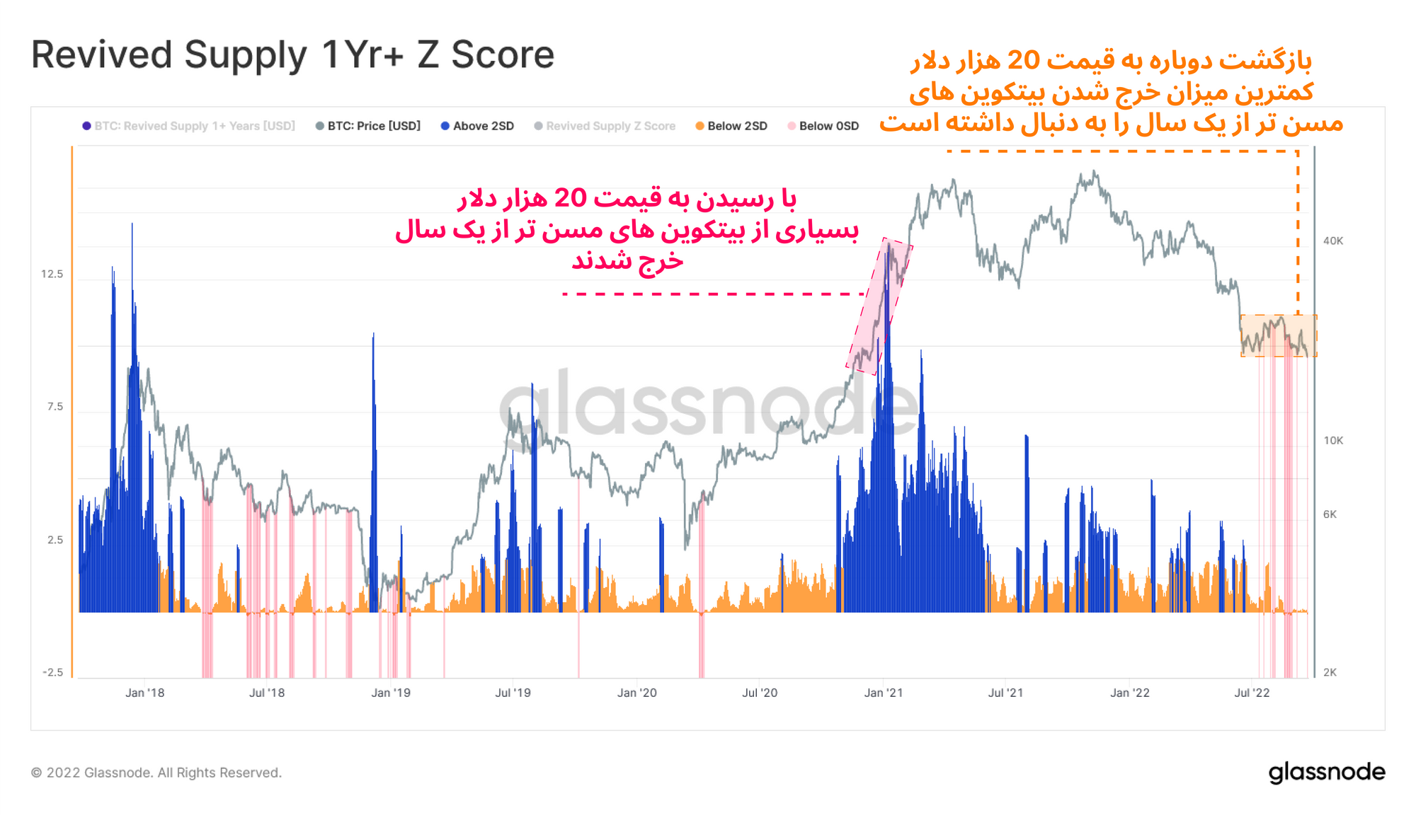 · با سقوط قیمت به ۲۰ هزار دلار در سال ۲۰۲۲، بازار واکنشی معکوس از خود نشان داد و تعداد بیتکوینهایی که پس از یک سال به چرخه بازار وارد شدند، بسیار اندک بودند. در واقع این تعداد از کف بازار خرسی ۲۰۱۸، به کمترین میزان خود رسیده است.