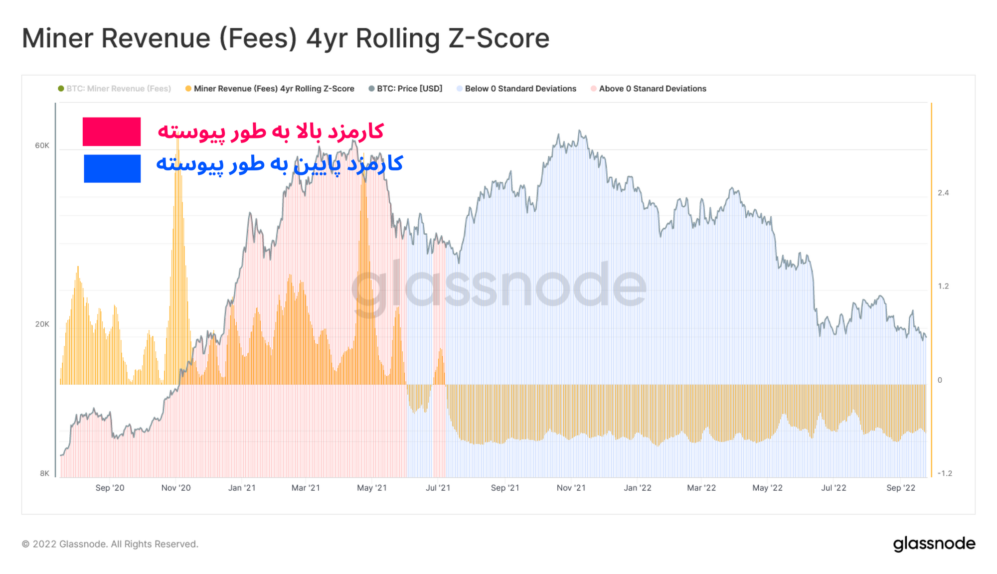 آخرین معیار برای بررسی فعالیت شبکه، درآمد ماینرها از کارمزدهاست. درآمد کارمزدی ماینرها مستقیماً به میزان تقاضا برای فضای بلاک و شلوغی شبکه مرتبط میشود. این معیار در گذشته یکی از معیارهای مهم برای شناسایی تغییر جهت بازار بوده است.