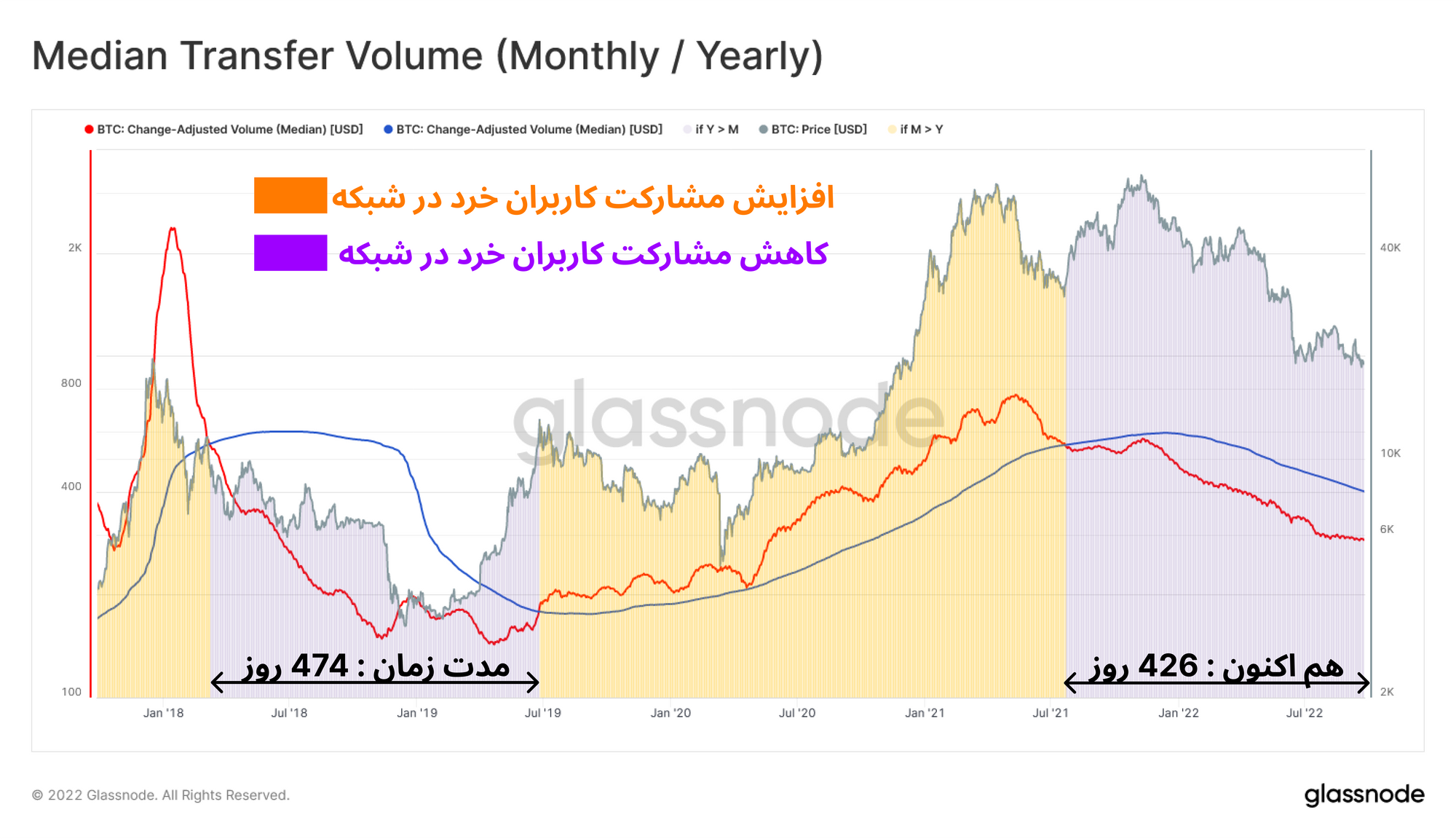 پس از مهاجرت ماینرها، کاربران خرد در بازه زمانی ۴۲۶ روزه، از شبکه خارج شدند🟪 که این دوره مانند بازه زمانی ۴۷۴ روزه خروج کاربران در فاز خرسی ۲۰۱۸ است و پس از آن، میانگین ماهانه کاربران خرد از میانگین سالانه عبور کرد.