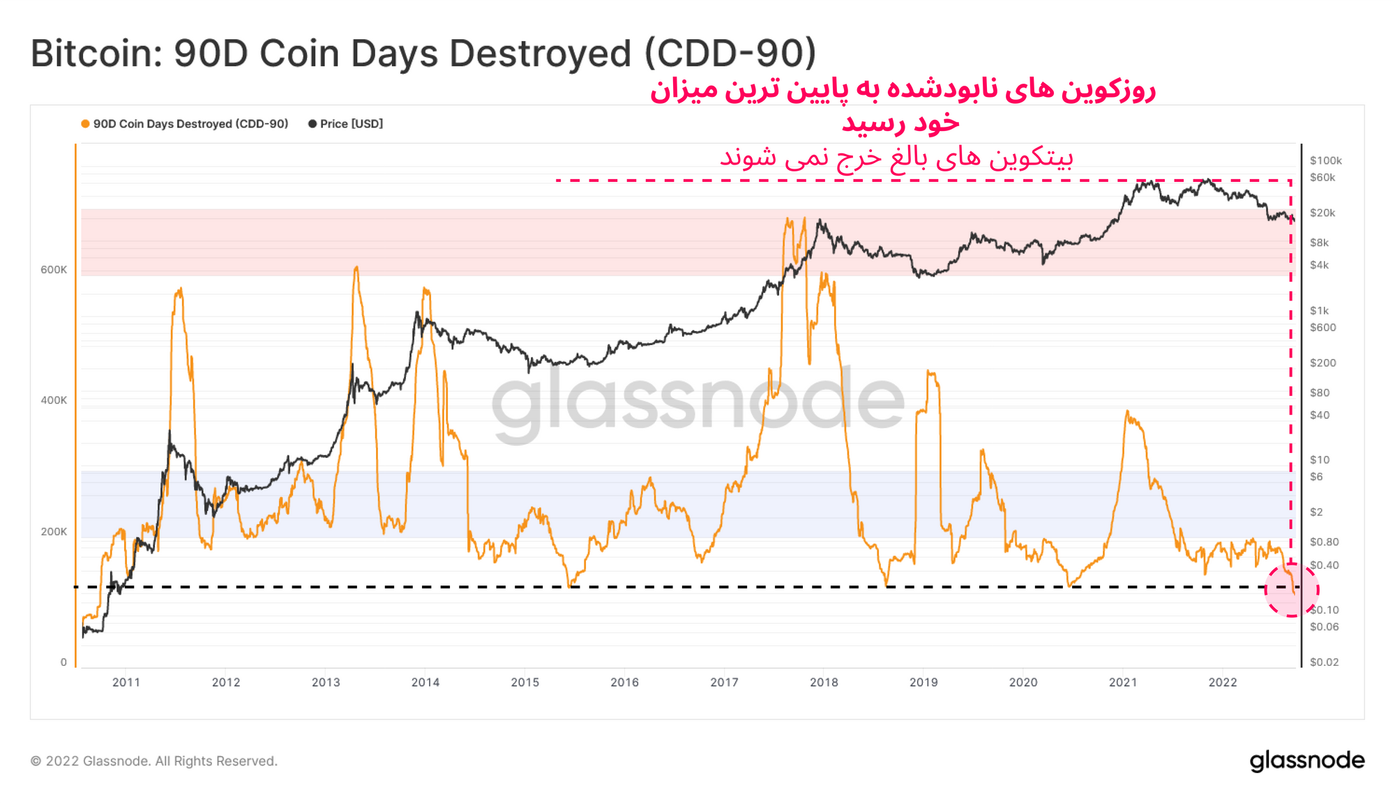 روزکوینهای نابودشده در ۹۰ روز اخیر به پایینترین میزان خود رسیدند ( بدون در نظر گرفتن قیمت قبل از سال ۲۰۱۱) که نشان میدهد بیتکوینهای پیرتر بیش از همیشه بر بازار تسلط دارند و اغلب سرمایهگذاران هولدر بودن را ترجیح میدهند.