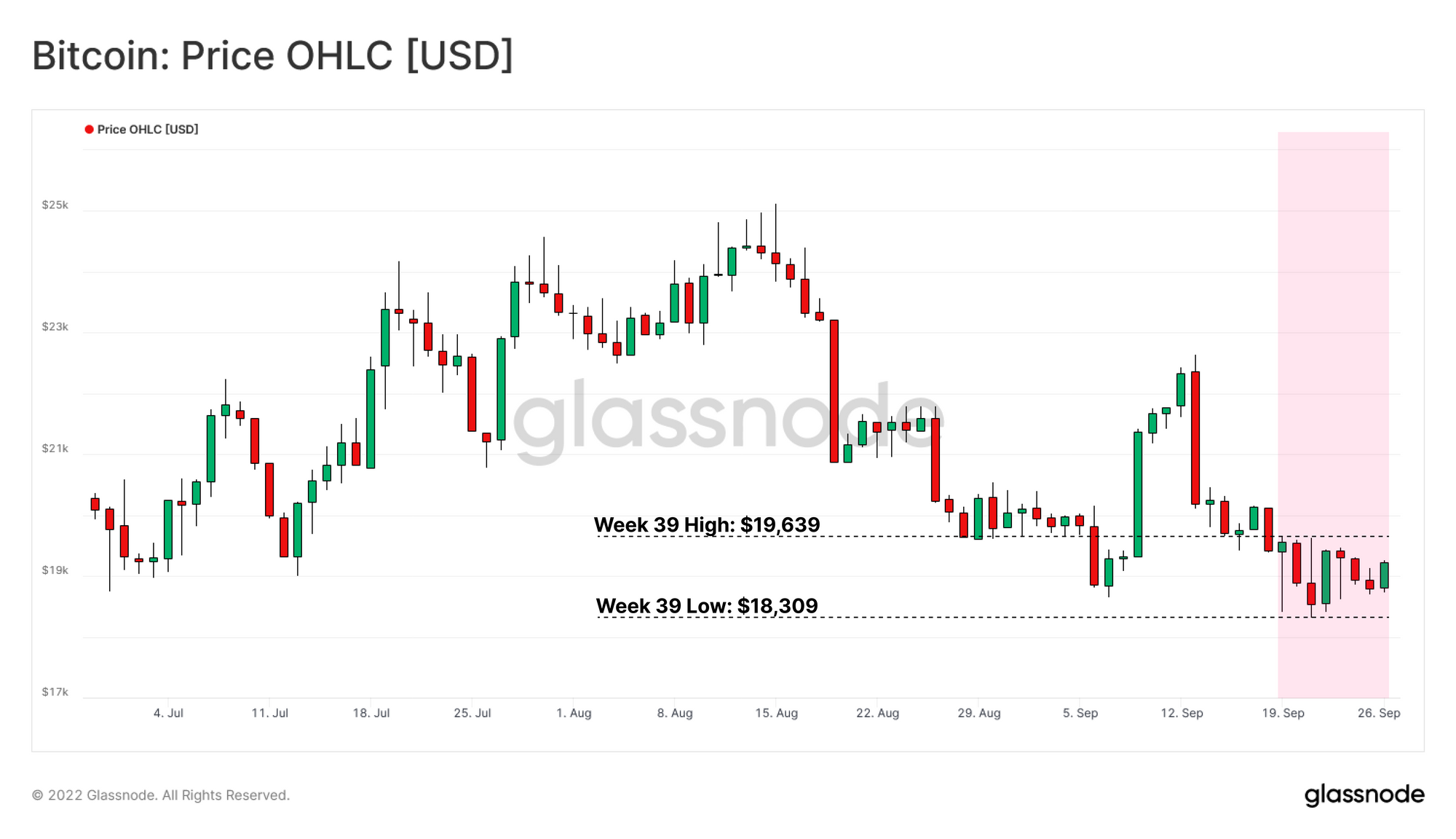 با وجود کمبود نقدینگی در بازارهای جهانی و شکست سقف در شاخص دلار، بیتکوین از خود قدرت نسبی نشان داده است. قیمت در این هفته بین ۱۹,۶۳۹ و کف ۱۸,۳۰۹ در نوسان بود. طبق پرایس اکشن، قیمت در تلاش است تا محدوده کف قیمتی ماه جولای را حفظ کند و با سقوط قیمت بازار دچار تسلیم همگانی نشود.