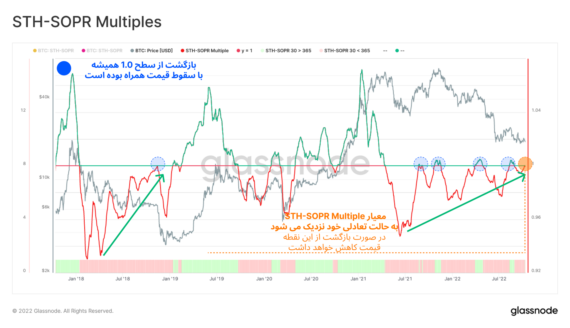 معیار STH-SOPR Multiple اکنون برای پنجمین بار تلاش میکند تا از محدودهی فاز خرسی این معیار عبور کند و به قدرتی دوباره برسد. این معیار در تلاش های قبلی موفق به عبور از سطح متعادل خود نشد و از آن سطح بازگشت که در نهایت موجب کاهش قیمت بیتکوین شد. اما با این حال به تدریج از شدت ضعف این معیار کاسته شده و احتمال ناامید شدن فروشندگان بیتکوین افزایش مییابد.
