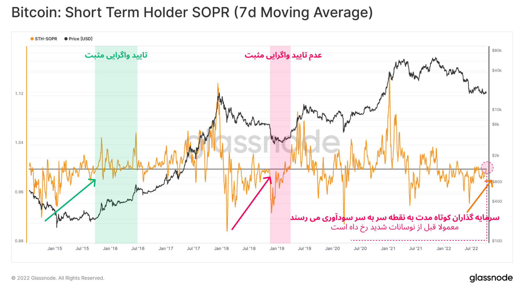 · 🟢 در فاز خرسی ۲۰۱۵-۲۰۱۶، میان قیمت و سود معاملات سرمایهگذاران کوتاهمدت، واگرایی شکل گرفته است. سطح ۱.۰ این معیار شکسته شد و پس از اینکه چندین بار متوالی به عنوان حمایت عمل کرد، این واگرایی مثبت تایید شد. این پدیده سبب شد تا سرمایهگذاران به جای خارج کردن سرمایه خود از بازار، در میانگین قیمت خرید بازار، بیتکوین بیشتری خریداری کنند.
