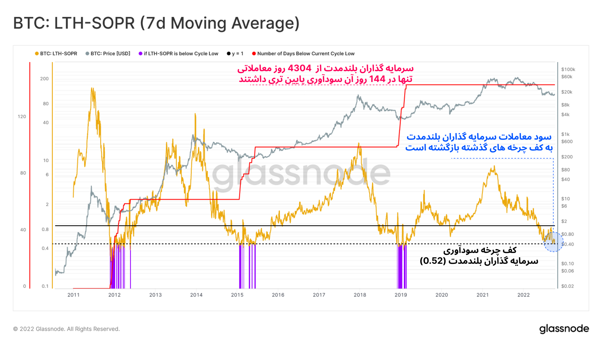 از طرف دیگر، سودآوری معاملات سرمایهگذاران بلندمدت به کف تاریخی خود میرسد و سرمایهگذاران به طور میانگین ۴۸ درصد ضرر نقد میکنند. با ثبات اخیر قیمت، بسیار واضح است که اغلب تراکنشهای سرمایهگذاران بلندمدت، متعلق به چرخه ۲۰۲۱-۲۰۲۲ هستند و در ضرر بیتکوینهای خود را میفروشند. معمولا سودآوری سرمایهگذاران بلندمدت در اعماق فاز خرسی به پایینترین مقدار خود میرسد که تنها ۳.۳ درصد روزهای معاملاتی نسبت به این مقدار، سودآوری کمتری ثبت کرده اند.