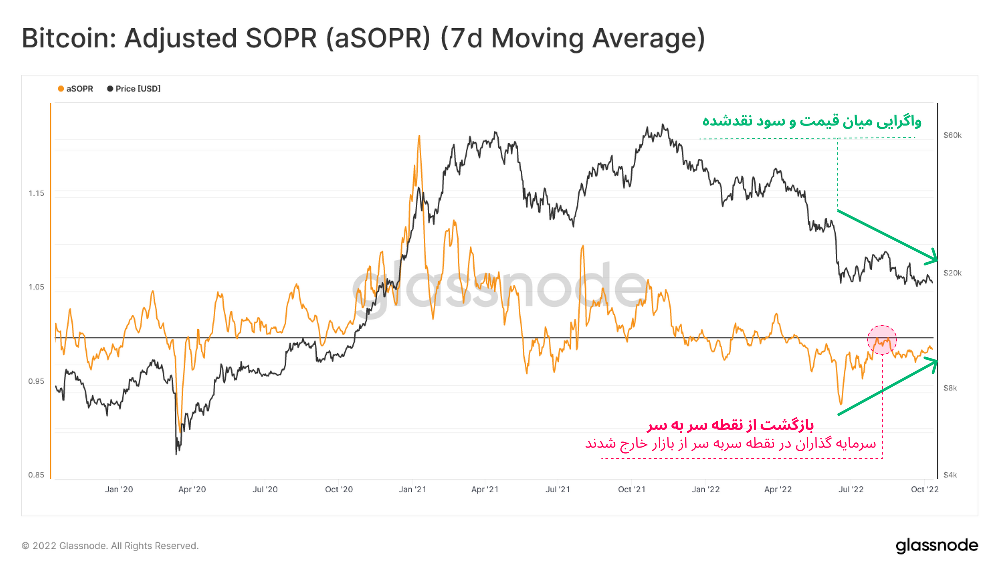 🔔پیشنهاد تنظیم هشدار: درصورتی که معیار aSOPR (7D-SMA) به بالای عدد ۱ برسد، به نشانهی بهبود سودآوری و احتمالاً تجدید قوای بازار خواهد بود.