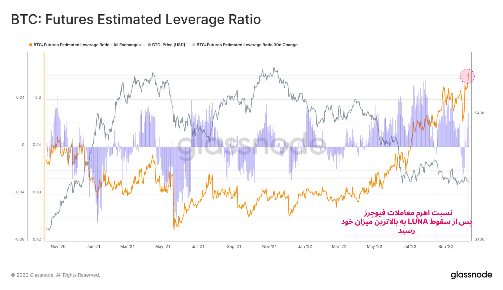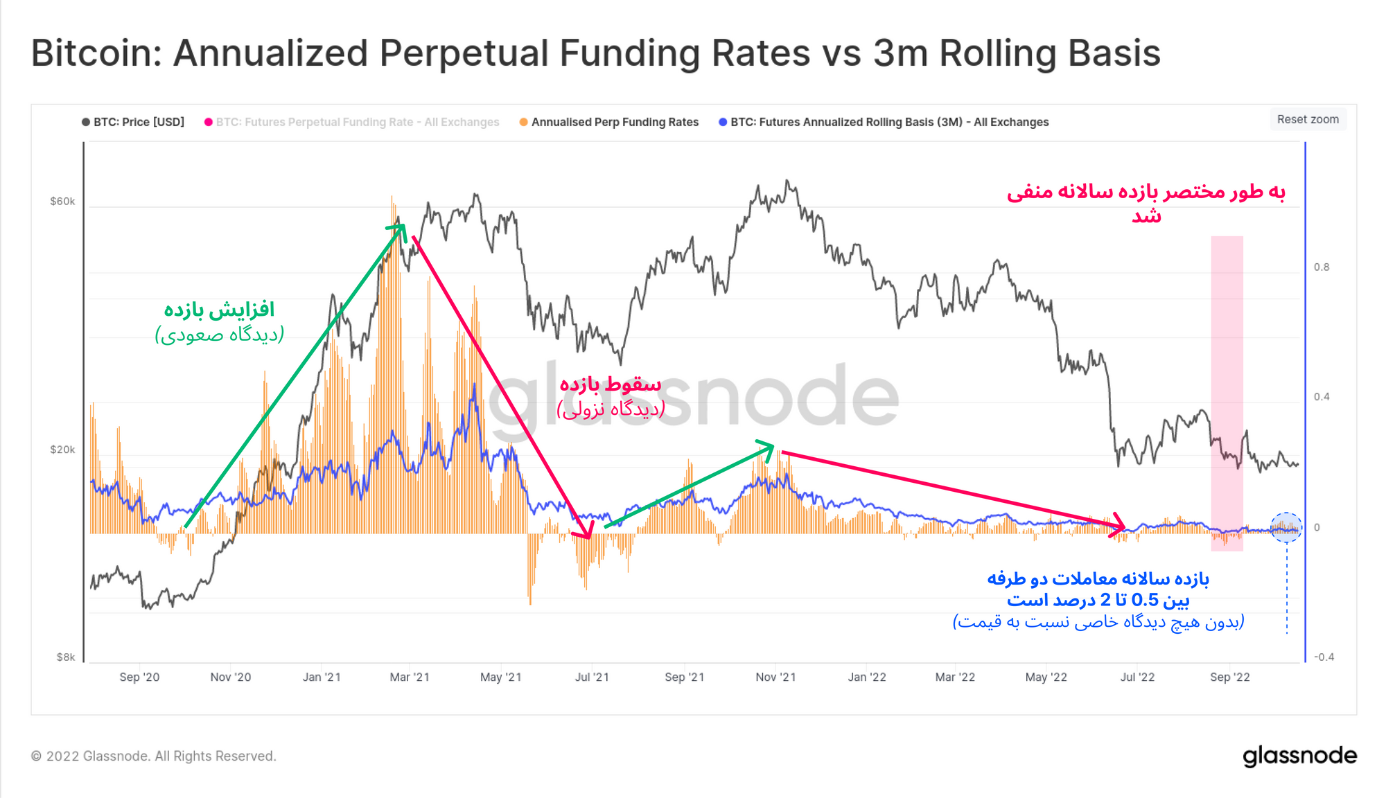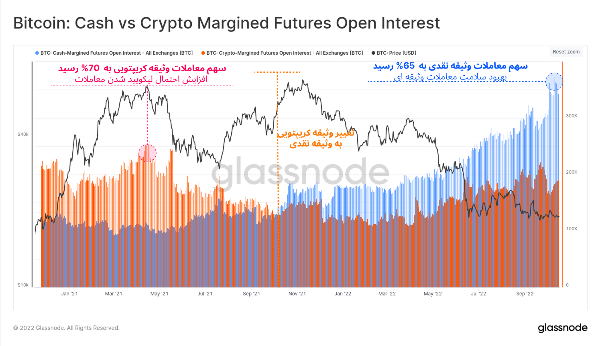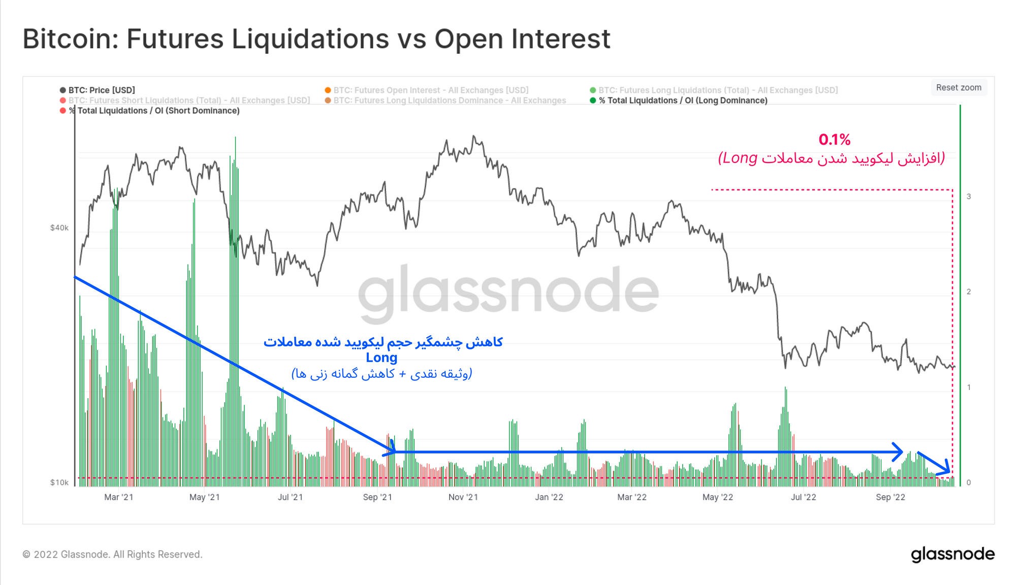 چندین عامل چنین شرایطی را ایجاد کرده است؛ تعداد معاملاتی که دارای وثیقه کریپتویی هستند کاهش پیدا کرده و با وجود افت قیمت، معاملات باز به صورت چشمگیری افزایش داشته اند. اما در کنار این عوامل، حجم معاملات لیکوییدشده به شدت کم بوده، به پایینترین میزان خود رسیده و در معاملات دو طرفه هیچگونه جهتگیری خاصی مشاهده نشده است. همچنین باید گفت که در ATH آوریل ۲۰۲۱، شرایط بازار فیوچرز دقیقاً بالعکس شرایط کنونی بوده که طبق گزارشات قبلی، بازار صعودی سال ۲۰۲۱، رسماً از این نقطه پایان یافته است.