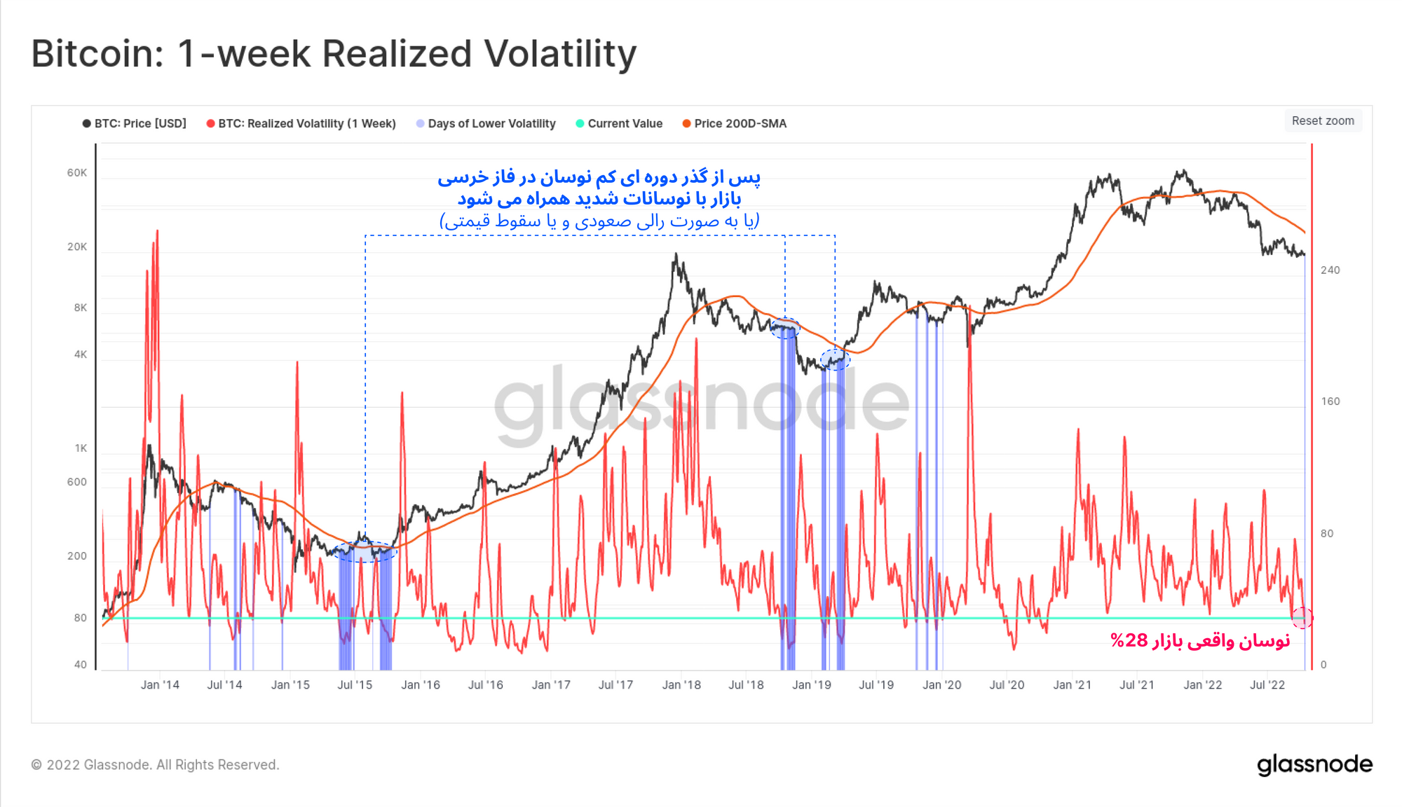 برای بیتکوین بسیار غیرعادی است که برای مدت طولانی، چنین نوسان کمی داشته باشد. معمولاً در تمام مواردی که قبلاً بیتکوین نوسان کمی تجربه کرده، پس از گذشت این دوره بازار با نوسان شدیدی همراه شده است. نمودار زیر نوسانات هفتگی بیتکوین را نشان میدهد و طبق آن هر زمانی که میزان نوسانات در فاز خرسی به زیر ۲۸ درصد رسیده، بیتکوین در هر دو جهت قیمتی، نوسان بالایی تجربه کرده است.